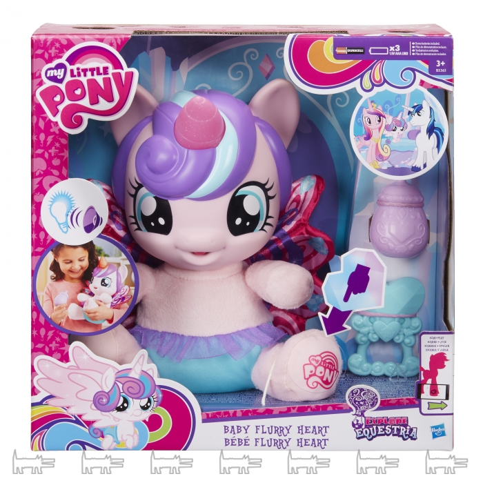 В волшебном мире Эквестрии произошло грандиозное событие – у принцессы Каденс родилась дочка. Теперь каждая девочка сможет понянчить плюшевую малышку. Рог, венчающий голову маленькой пони-принцессы, сияет разными цветами. Игрушка реагирует на прикосновения – она засмеется, если погладить ее по животику, у нее светится рог и она реагирует на громкие звуки. Малышку можно покормить из специальной бутылочки, которая идет с игрушкой в комплекте. Предназначена для детей от 3 лет.