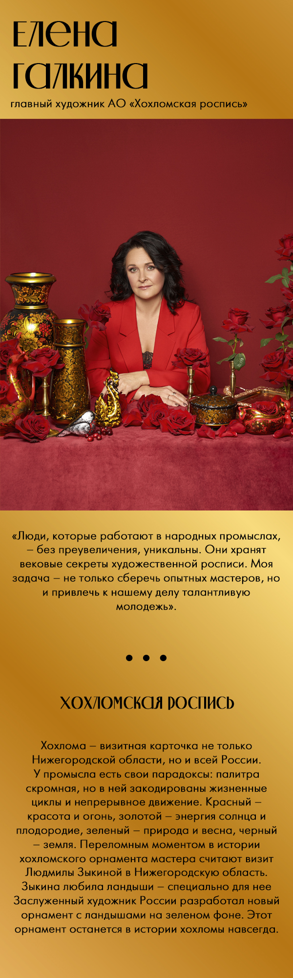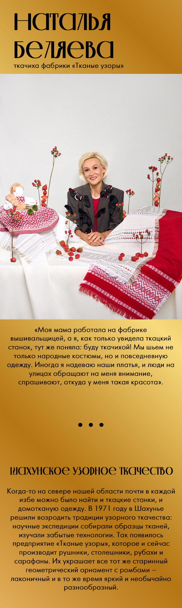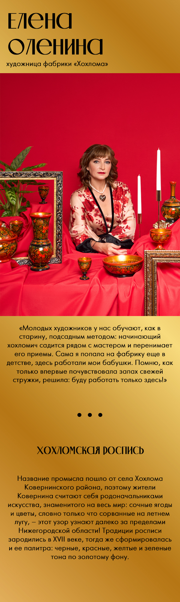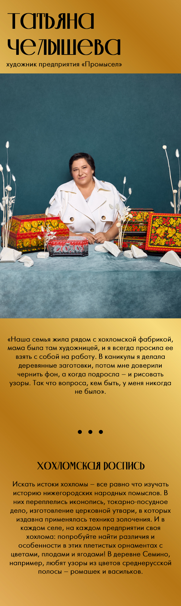 В Шахунье примерить рубаху с узором, вытканным точно так же, как и столетия назад. И, конечно же, взглянуть на село Хохлома в Ковернинском районе, в честь которого и назван знаменитый промысел. Герои нашего фотопроекта – жители этих мест. Из поколения в поколение они передают секреты своих промыслов, из которых и складывается наша общая культурная ДНК.
