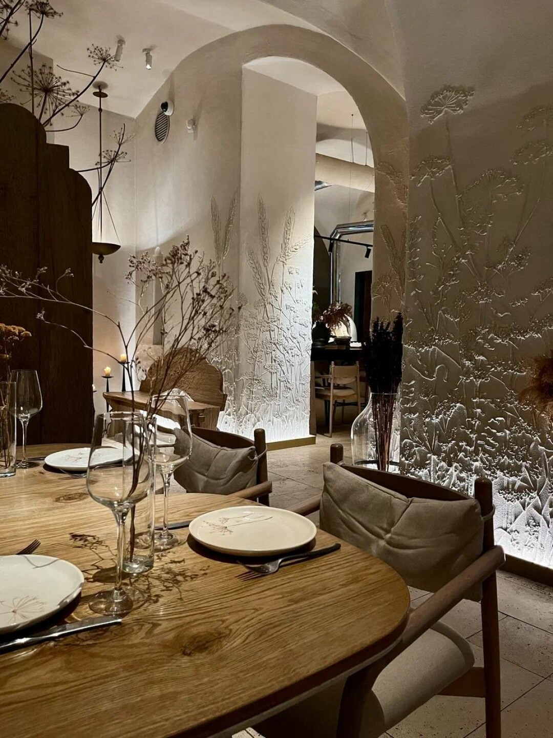 Ресторан входит во все топы федеральных премий. В конце концов здесь просто красиво. Стены украшены оттисками трав, которые растут неподалеку: пижмы, душицы, зонтиков укропа и колосьев проса.