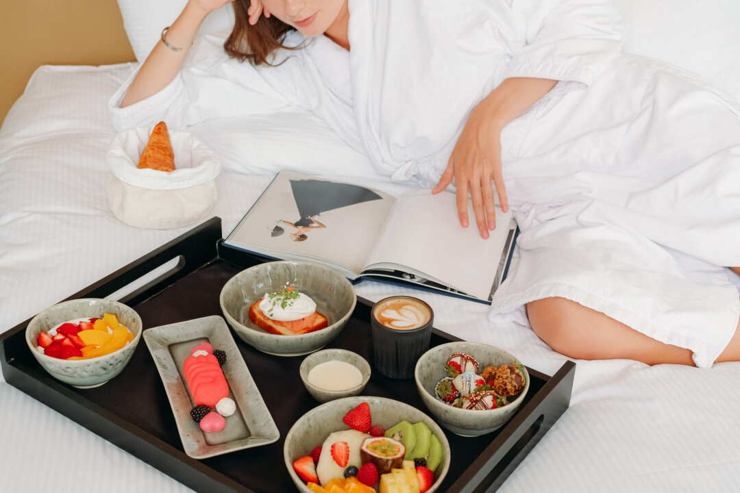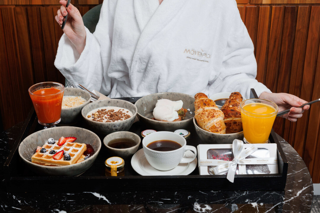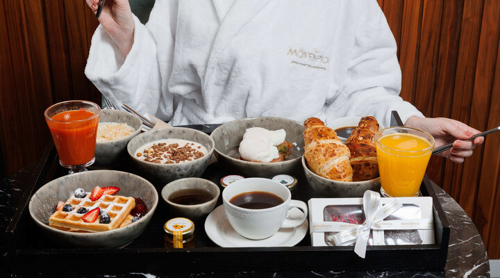 Гость может выбрать из трех вариантов завтрака в постель: романтичный, праздничный или фирменный швейцарский — и в удобное время, а не только до 10 утра. Главное, успеть заказать его накануне, минимум за 12 часов.