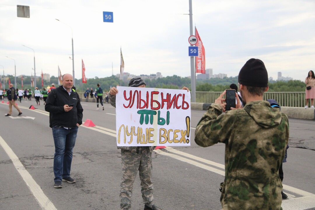 Многие бегуны отмечали, что во время забега было очень душно. Но сразу после добавляли, что это не так важно, потому что была классная атмосфера праздника. За нее участники особенно благодарны болельщикам. Выделили даже самого главного - девушку, которая стояла на Канавинском мосту с плакатом «Ради вас пол города перекрыли, а вы пешком идете».