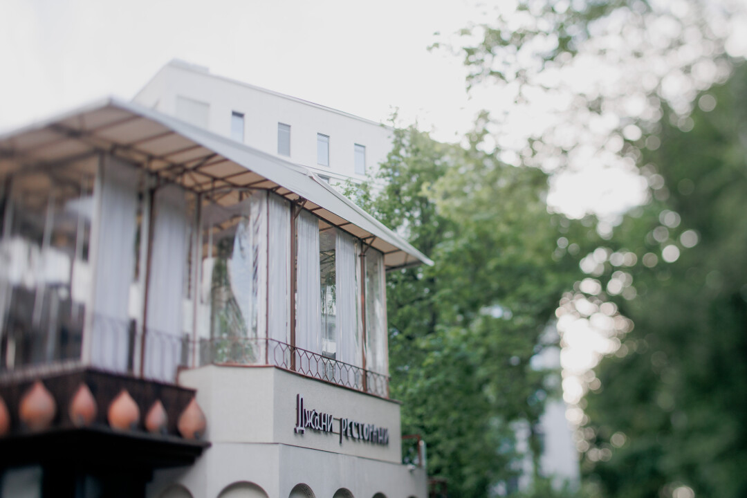 Они застеклили разноуровневую крышу, добавили света игривыми лампочками, и получилась очень уютная веранда в парке. Кухня с грузинским акцентом, но банкетное меню достаточно проработанное.