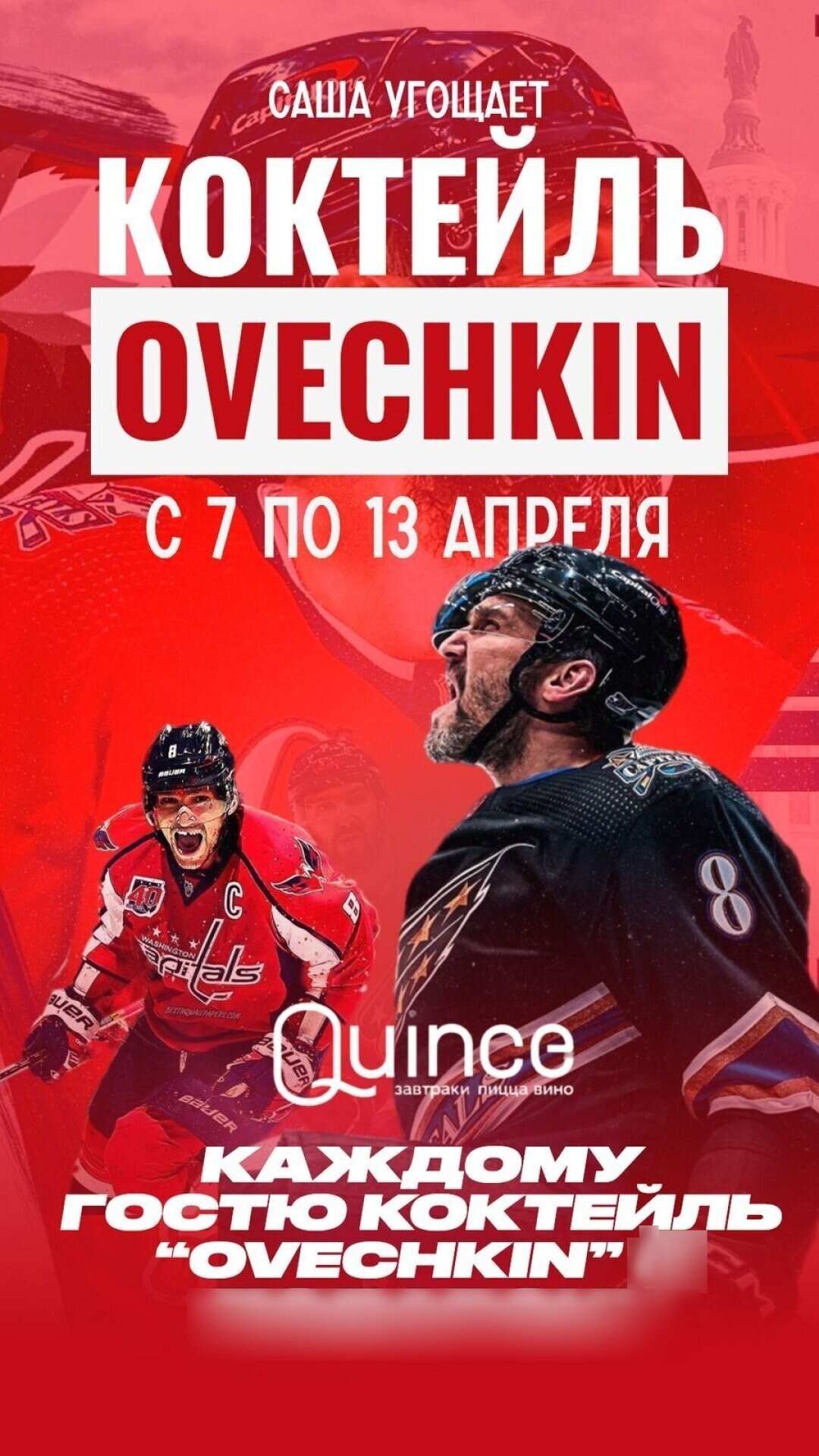 Александр Овечкин – легенда хоккея, повторил рекорд Гретцки! И это нужно отпраздновать! До 13 апреля QUINCE угощает каждого гостя коктейлем OVECHKIN!