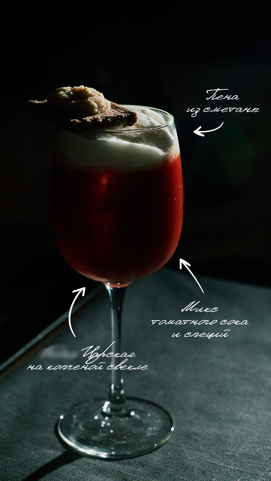 В составе: беленькая, настоянная на свекле и специях; томатный сок с нотками укропа и чеснока; лимонный сок для свежести.
