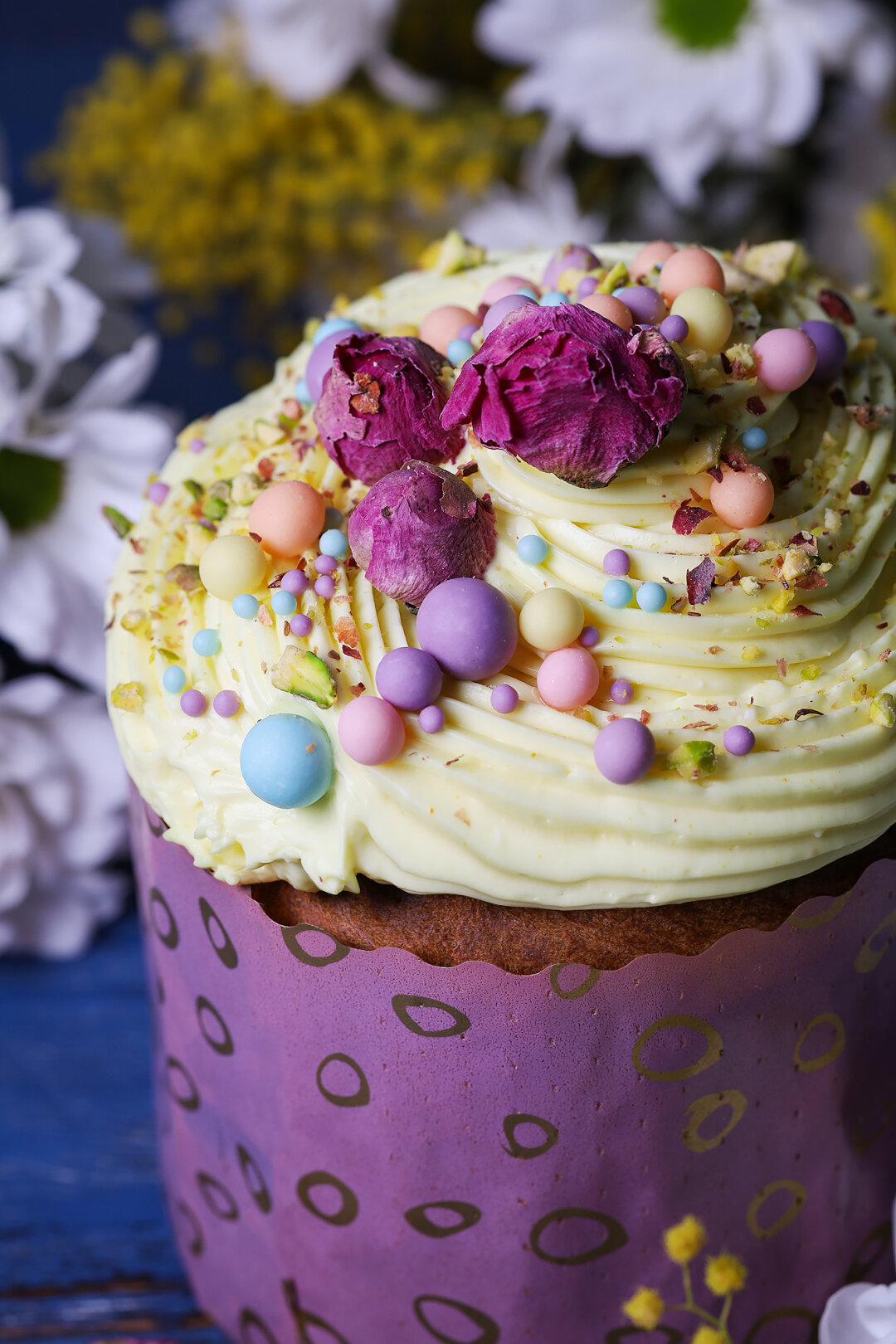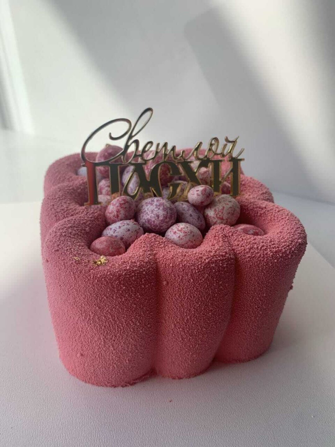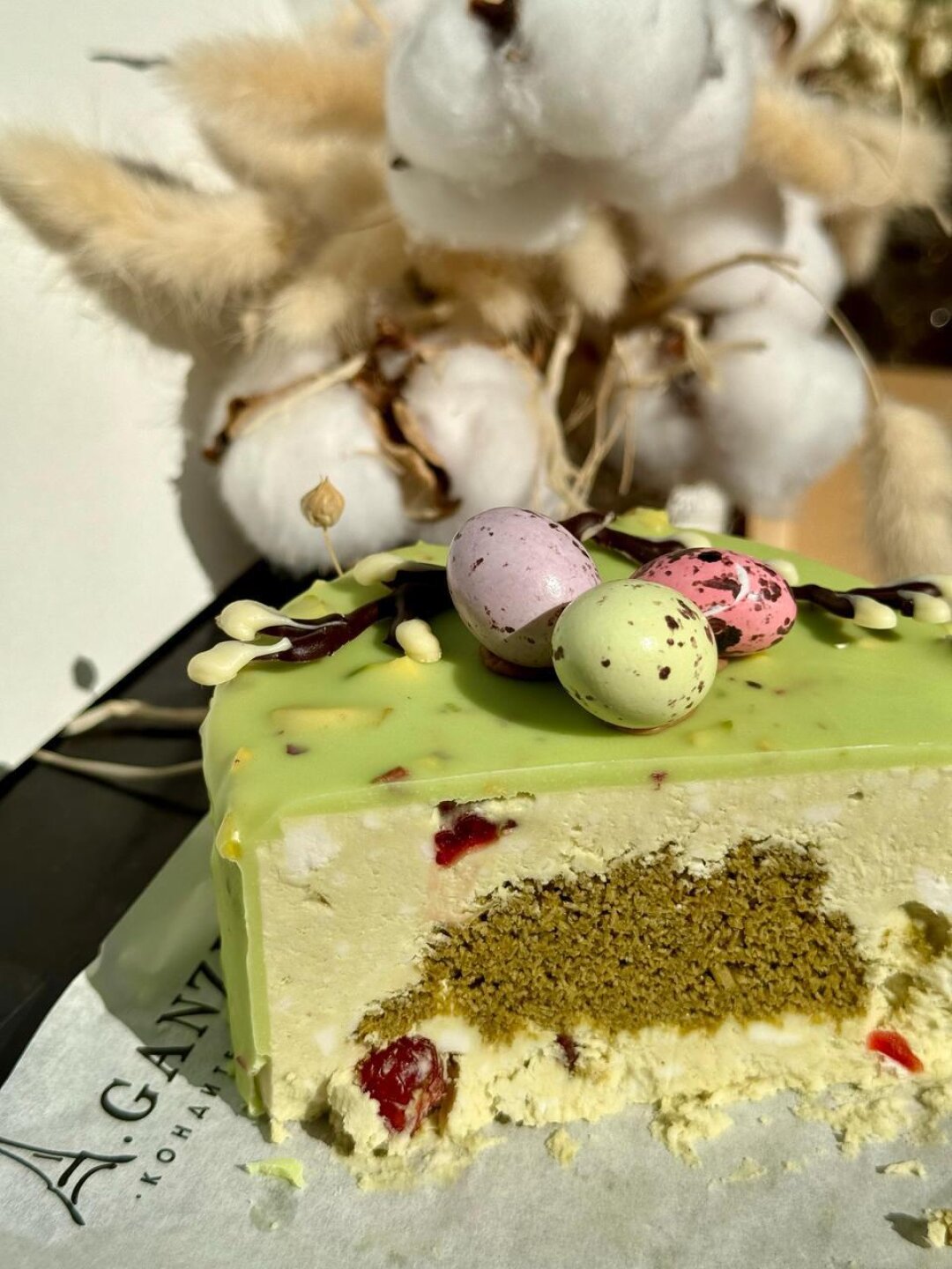 Нежная текстура кулича, кисло-сладкий малиновый крем и хруст фисташек. Для любителей смелых вкусовых решений.