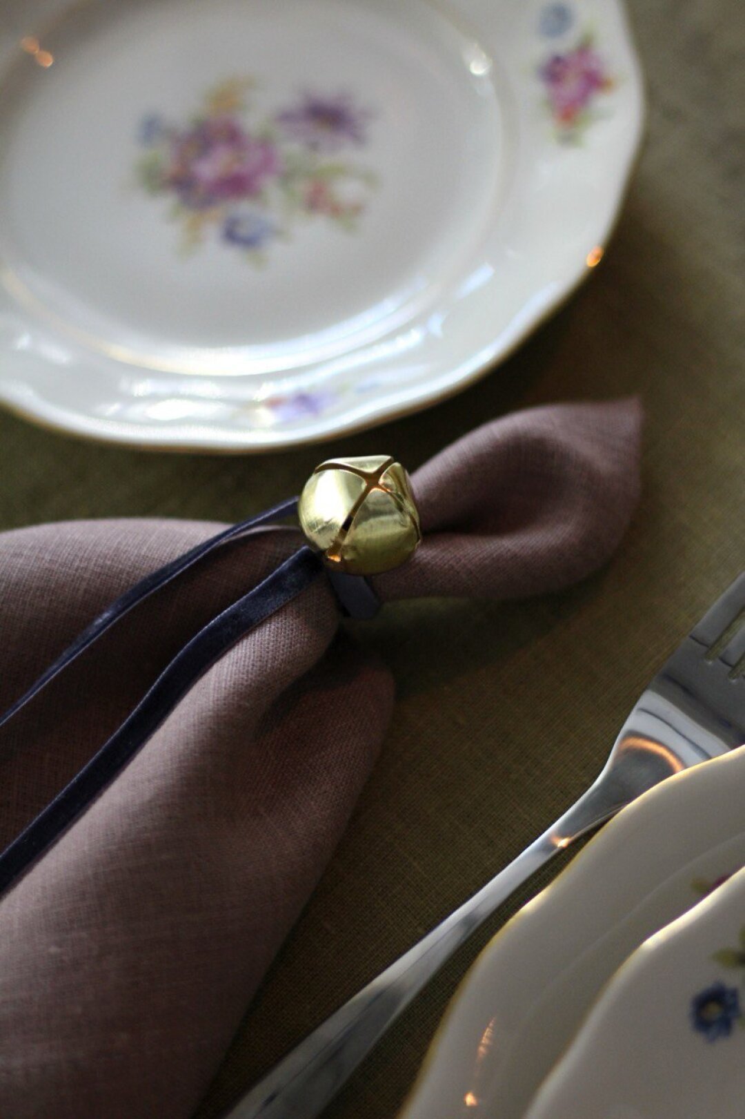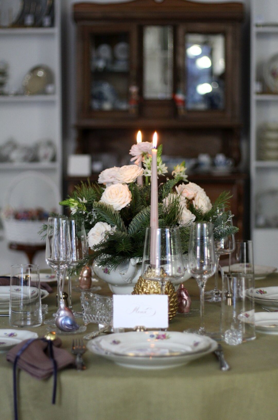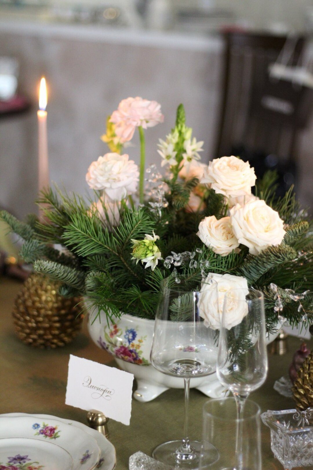 Сервиз с флоральным мотивом? Нас это не смущает. Добавим новогоднего настроения за счет деталей: флористическая композиция из вечно зеленых в супнице, бархатные ленты и бубенцы из магазина для творчества, свечи в виде советских елочных игрушек и винтажные аксессуары для стола добавят шарма сервировке.