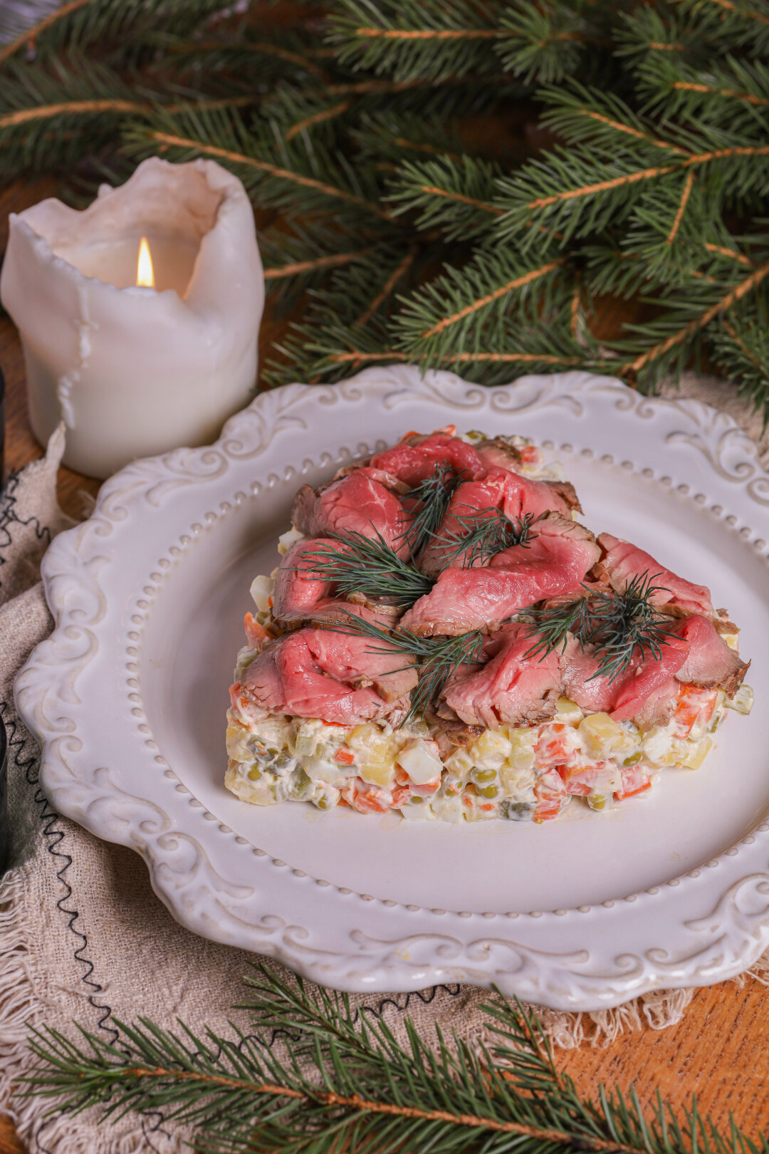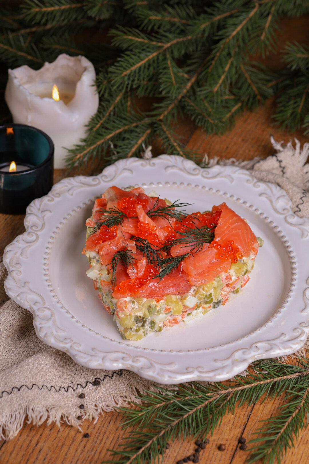 - Оливье с докторской колбасой/цыпленком/говядиной/лососем