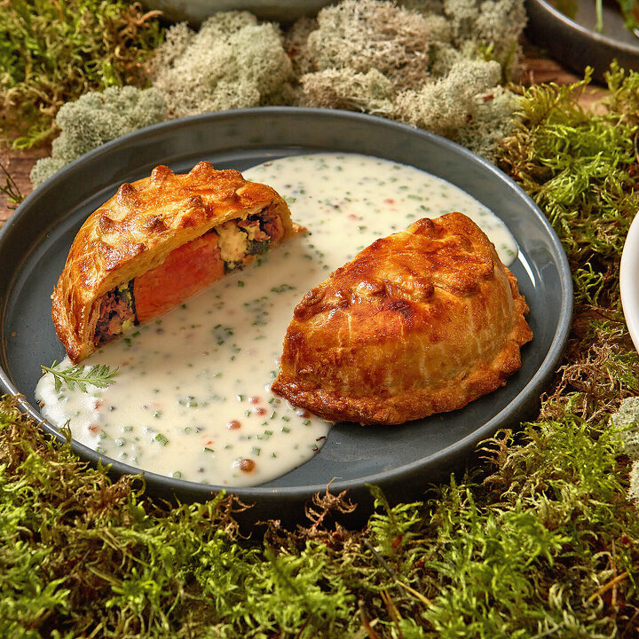 Кулебяка с палтусом и лососем и икорным соусом от Станислава Левохо, бренд-шефа ресторана «Банщики», Санкт-Петербург