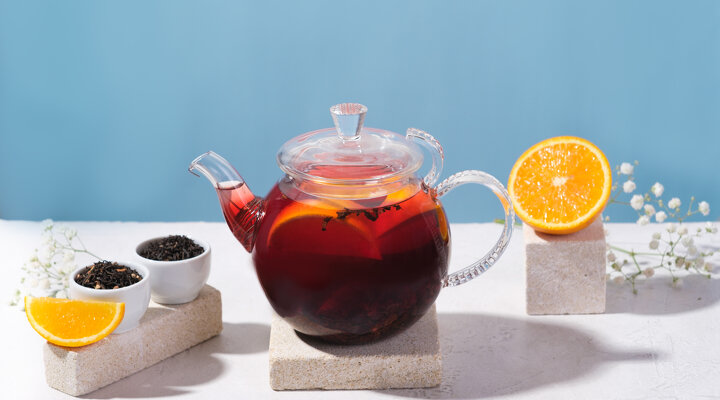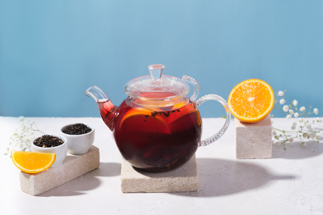 - В завершении добавить в чайник дольки апельсина и палочку корицы, аккуратно перемешать и дать настояться несколько минут.