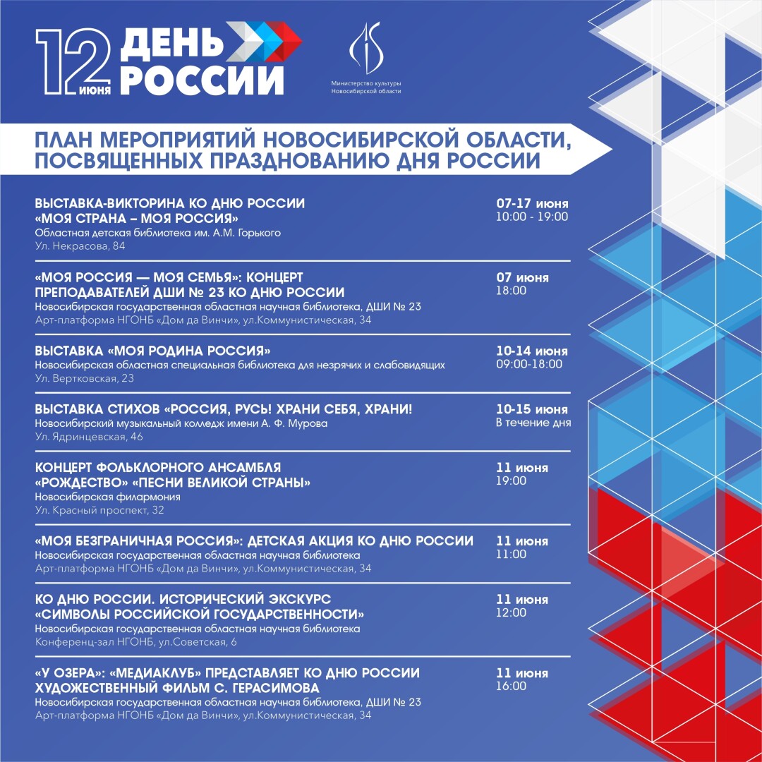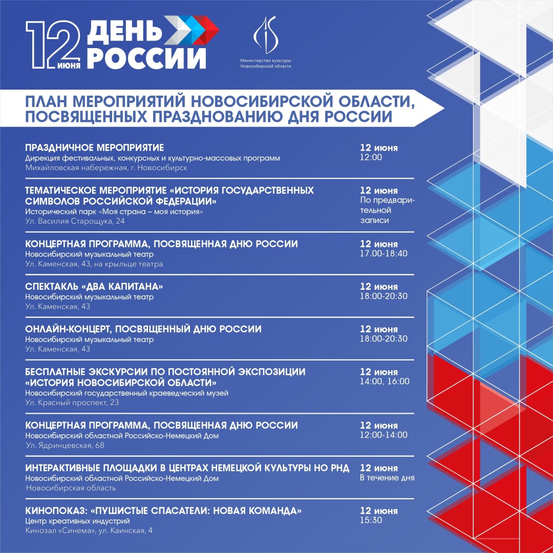 12 июня в столице Сибири пройдет празднование Дня России. Государственные учреждения культуры Новосибирской области подготовили к государственному празднику тематические выставки, спектакли, концертные программы, фестивали, конкурсы, акции, экскурсии, литературные гостиные и другие мероприятия.