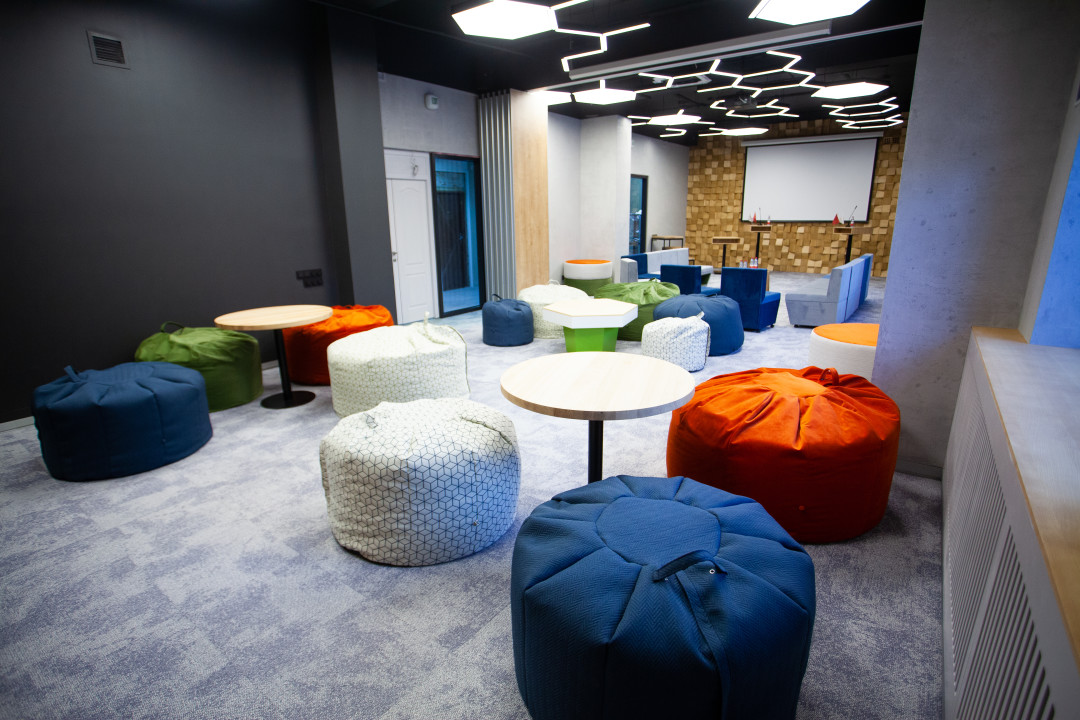 Дизайн выполнен в стиле эко-лофт: это крафтовые элементы в интерьере, природные материалы и в то же время широкая функциональность площадки. Мы оснастили залы модульной мебелью, которая позволят создавать десятки вариантов обстановки. Скажем,утром зал может представлять собой единое строгое деловое пространство, после обеда он уже разбит на несколько частей для проведения командных занятий, коворкинг-сессий, а вечером — это непринужденная обстановка с мягкими зонами и баром. Вариантов масса.