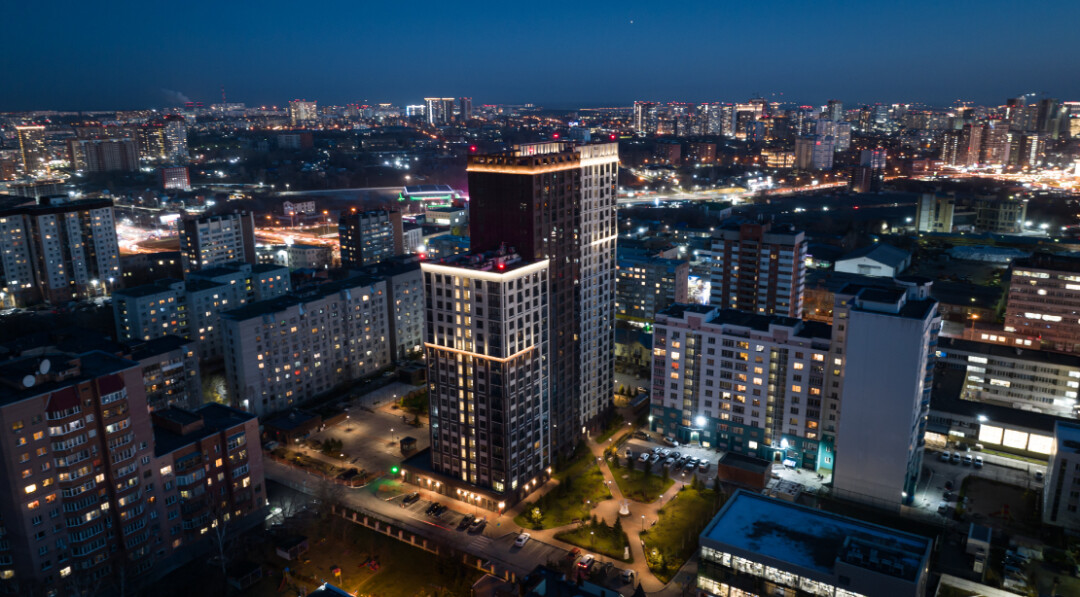 С наступлением темноты в доме включается архитектурное освещение, которое выделяет его на фоне окружения. Дом привлекает внимание с первого взгляда: вертикальные линии, витражное остекление создают объем и игру света. Гармоничное сочетание двух оттенков кирпича – белого и бургундии подчеркивают выразительность фасада. Каждый кирпич темного оттенка с жемчужными переливами уникален и под разными углами меняет свой оттенок. К слову, Державина, 50 – единственный проект, на котором он использован, не только в Новосибирске, но и за Уралом.
