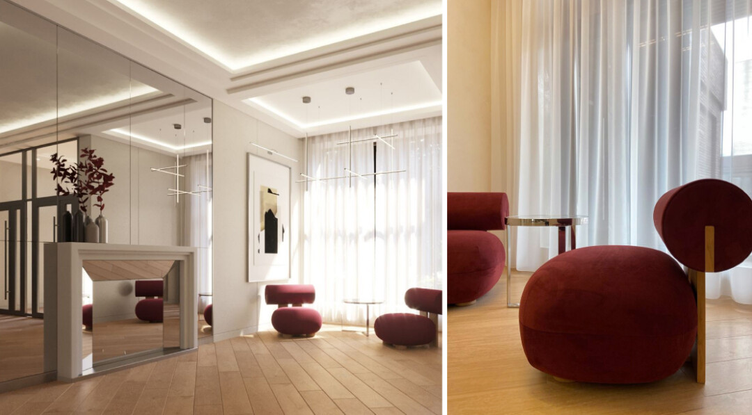 Отделка входных групп, этажей, лифтов выполнена по индивидуальному проекту. В парадном холле гармонично сочетаются: керамогранит, декоративная штукатурка, стекло, зеркальные фрагменты. Панорамные окна наполняют пространство обилием естественного света. Дизайнерская мягкая зона для отдыха и картины, нарисованные художником, погружают жителей в атмосферу комфорта и уюта уже при входе в дом.