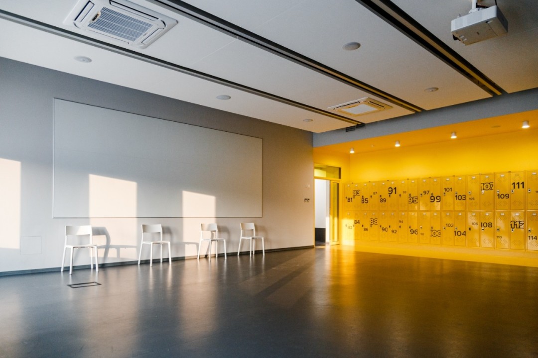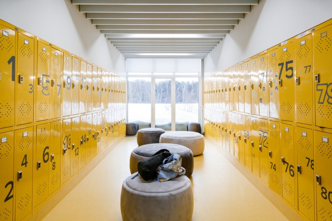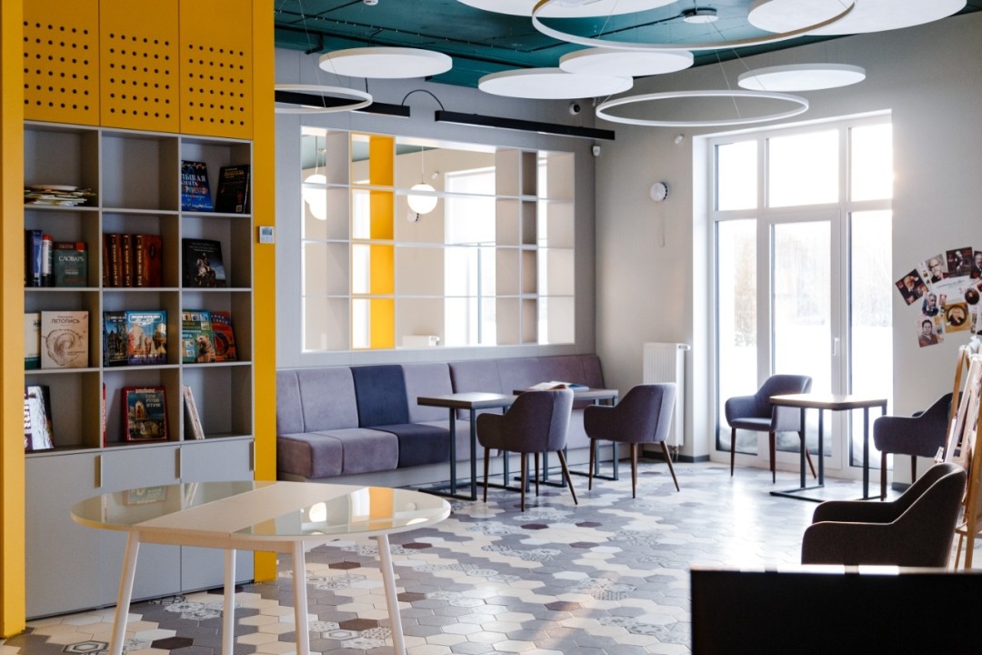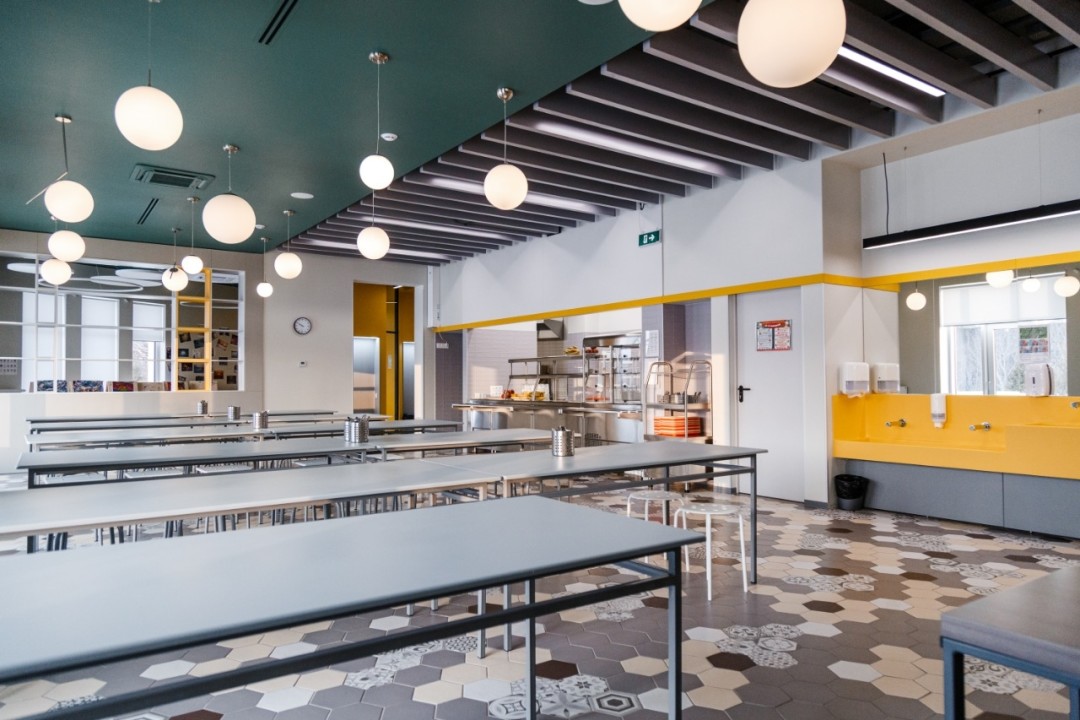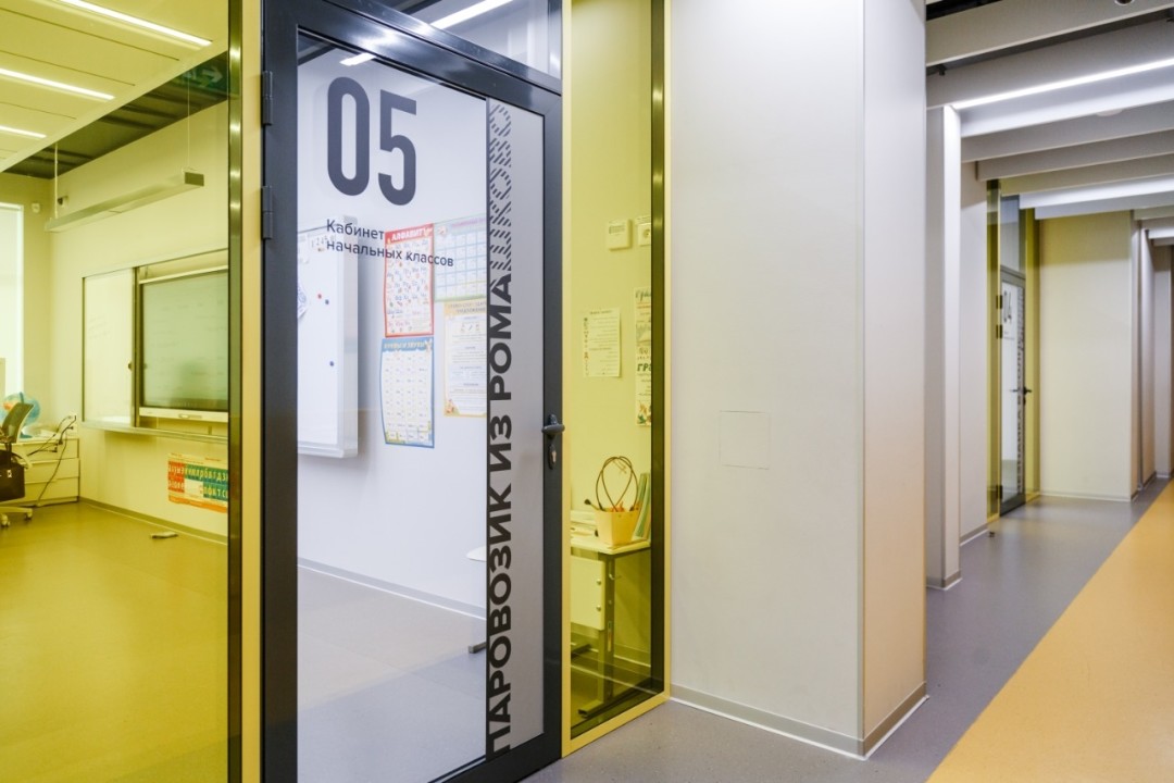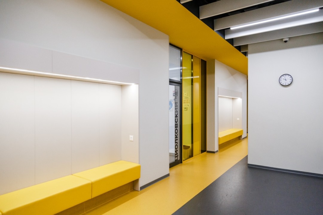 - организация пространства без границ – панорамные окна, благоустроенная пришкольная территория и желто-серая цветовая гамма, способствующая активной деятельности и хорошему настроению.