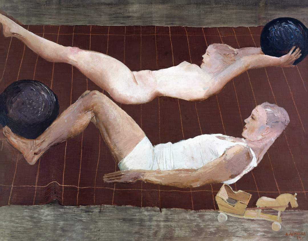Одна из самых странных картин Дейнеки, которая постоянно вызывает вопросы у зрителей, но лучше всего иллюстрирует советское равноправие начало тридцатых. Мужчина и женщина занимаются на одном коврике, выполняют одно и то же упражнение с черным резиновым мячом, только вот мужчина одет в спортивные трусы и майку, а женщина почему-то полностью обнажена. Прямолинейный и несколько дубовый спортивный эротизм эпохи 12-метровой «Девушки с веслом» и открытых нудистских пляжей, которые так будоражили Даниила Хармса, превращается здесь в аллегорию молодой советской семьи: в правый угол полотна закатилась деревянная игрушечная повозка. Кстати, двойная интимность сюжета подразумевает, что пара занимается не в общественном пространстве, а у себя дома, и вряд ли это коммуналка или барак. Так что перед нами – еще и поэма вполне мещанского благополучия «знатных людей страны Советов».