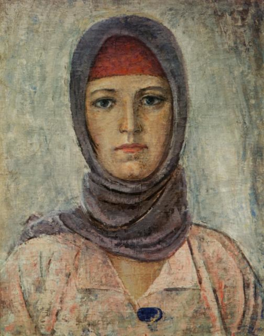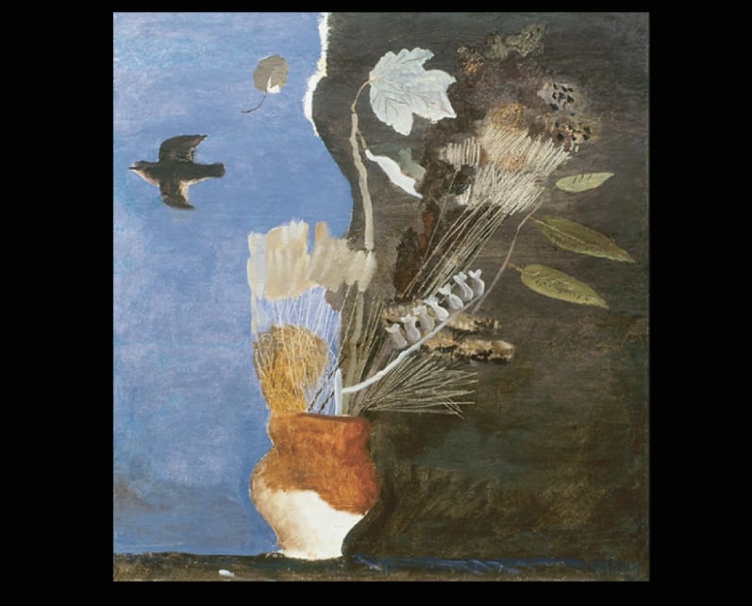 Одна из лучших, хотя и не самых известных картин Дейнеки – часть небольшой серии 1933 года со сквозным мотивом букета из сухих листьев в глиняной вазе. Вещь «чисто лирическая» и «безыдейная», но все-таки связана с большими спортивными и военными полотнами своей сухостью, напряжением композиции и монументальностью, близкой плакату. Скорость и остановка, живая и мертвая природа. Откинутая штора, как театральный занавес, открывает стальное небо, в которое прочно вмонтирован силуэт птицы и осиновый лист. Главное здесь – плоскости и фактуры: следы жесткой кисти, процарапанные элементы, сочетания плотных и незаписанных частей объединяет приглушенно-земная фресковая гамма, близкая, скажем, полотнам британского живописца 1930-х Пола Нэша. Аскетичная и совершенно декоративная, в 1933 картина украсила бы любой кабинет, а вот уже через несколько лет считалась бы формализмом, пусть и не очень опасным.
