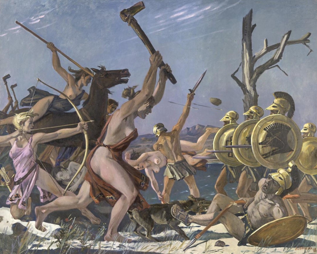 Одна из самых тяжеловесных и неудачных работ Дейнеки, где почти все завоевания довоенного искусства проваливаются в глубокую яму. Герои «Строгого юноши» заплакали бы от горя, а революционерки от ярости. Античный сюжет – но ходульный и недостоверный. Экспрессионизм – но уже уставший сам от себя, хотя солдат на первом плане честно пытается изобразить ужас. Вдобавок откровенным фарсом смотрится диспропорция сил. С одной стороны – гоплиты в новеньких шлемах, скрытые щитами, с другой – голые девушки в сползающих розовых ночных сорочках, размахивающие каменными топорами. Одну героиню воин обхватил поперек и готовится не то отшлепать, не то разрубить, как колбасу. Участие женщин во Второй мировой войне встревожило не только Дейнеку: именно в сороковых воинственные супергероини в бронелифчиках (начиная с Чудо-Женщины – королевы амазонок) начали занимать места в массовой культуре.
