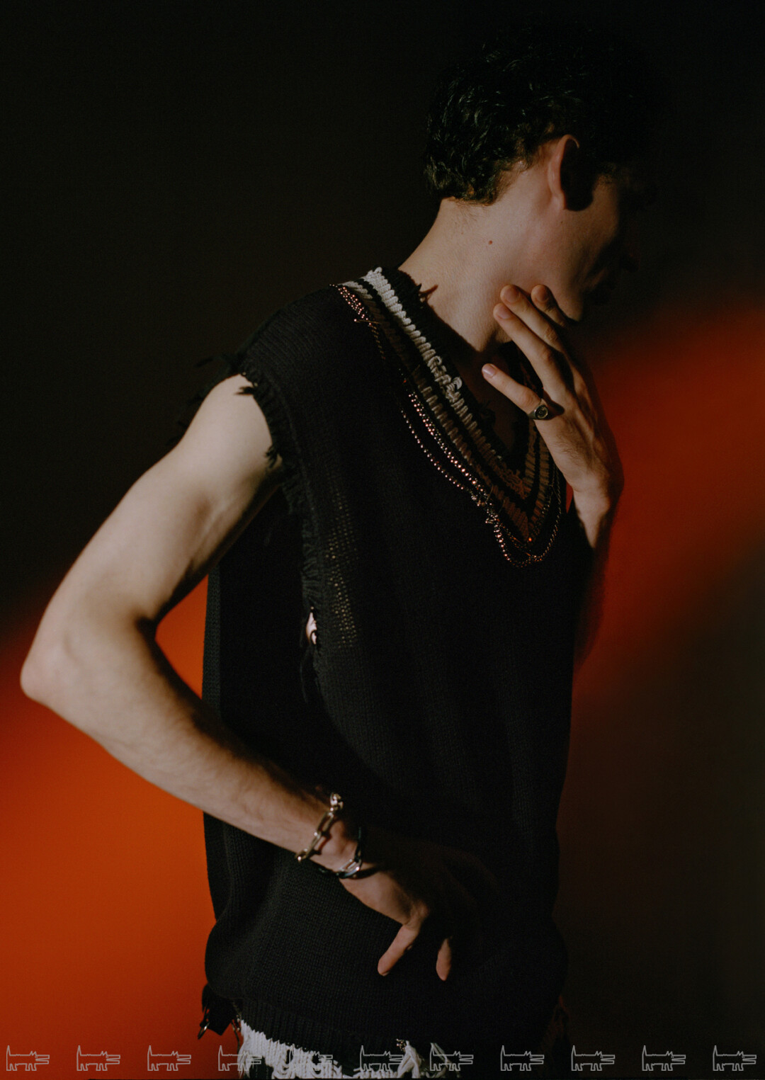 Жилет R13 (ЦУМ), кольцо-печатка MOMOCREATURA, кожаный браслет с карабином HAND AROUND, браслет-цепь WILDHORN (все — Poison Drop)