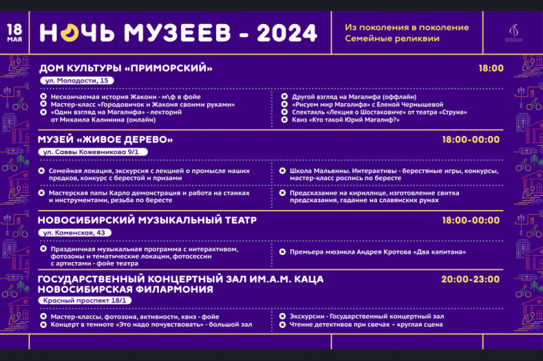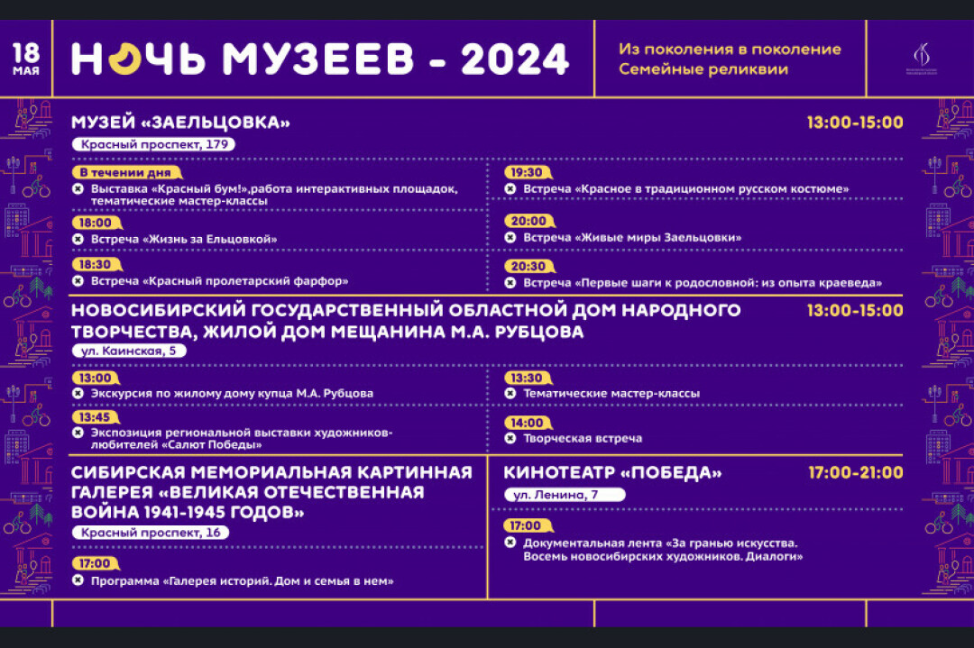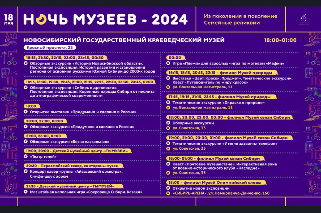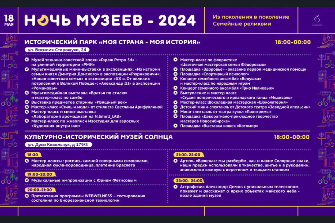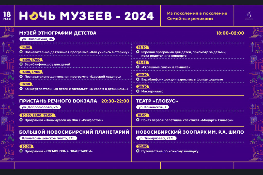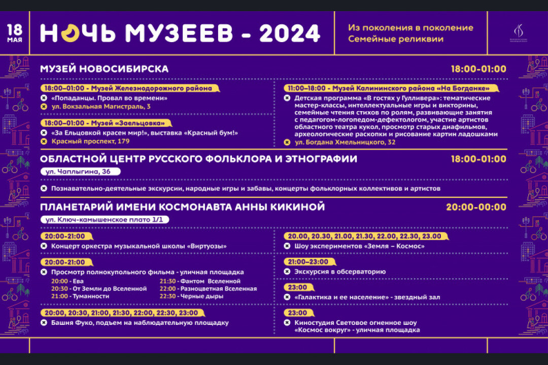Более 200 мероприятий пройдут в Новосибирской области в ночь с 18 мая на 19 мая в рамках ежегодной акции «Ночь музеев». Ключевая тема акции в 2024 году – «Из поколения в поколение. Семейные реликвии».