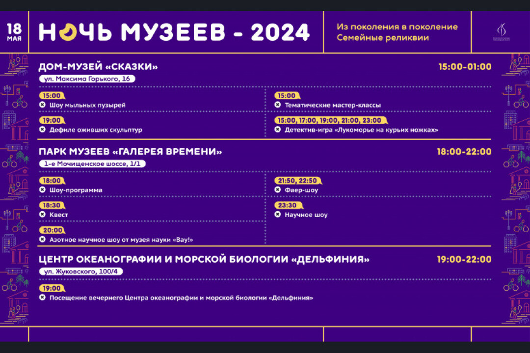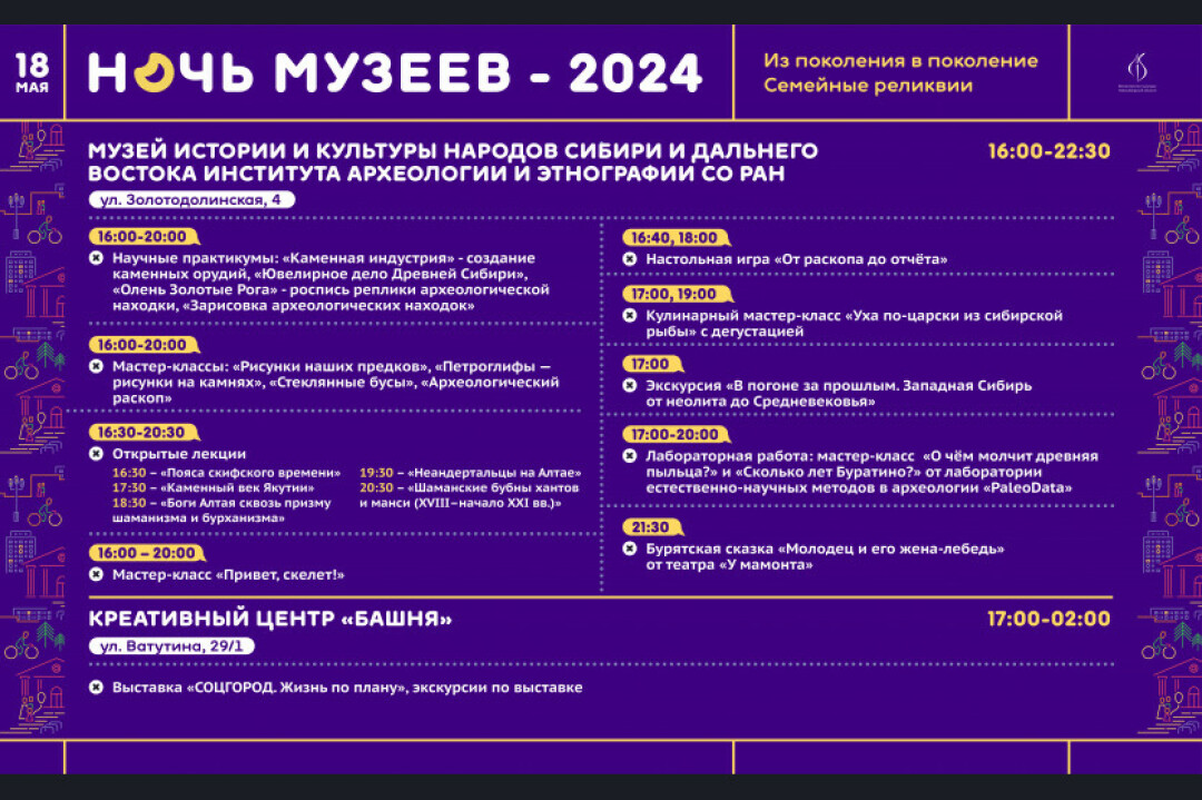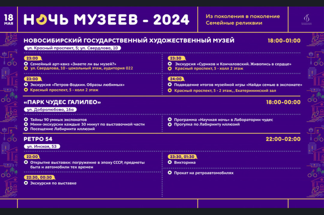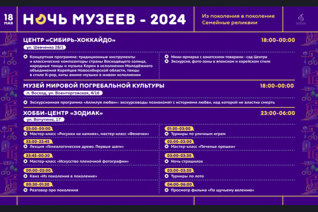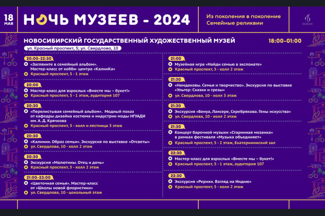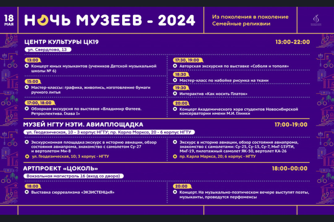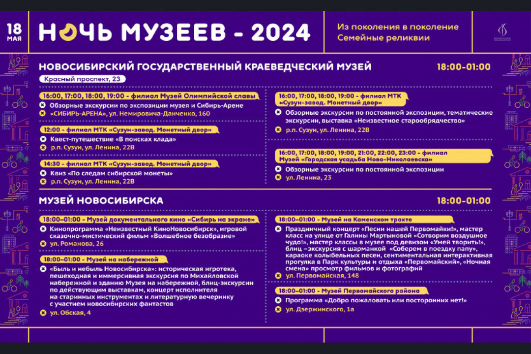 Более 200 мероприятий пройдут в Новосибирской области в ночь с 18 мая на 19 мая в рамках ежегодной акции «Ночь музеев». Ключевая тема акции в 2024 году – «Из поколения в поколение. Семейные реликвии».