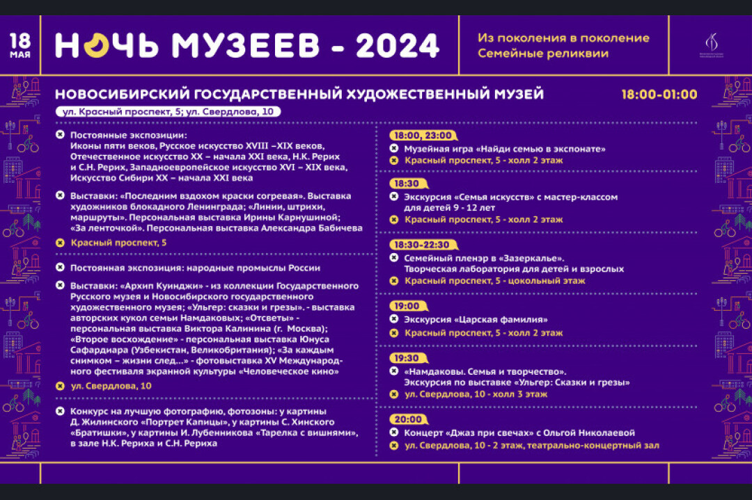 Главным событием акции в Новосибирском государственном художественном музее станет выставка работ великого русского художника Архипа Куинджи из коллекции Государственного Русского музея. Сквозной линией всех мероприятий станет тема семьи: экскурсии «Калинин. Образ семьи» по выставке «Отсветы», «Намдаковы. Семья и творчество» по выставке «Ульгер: Сказки и грезы».