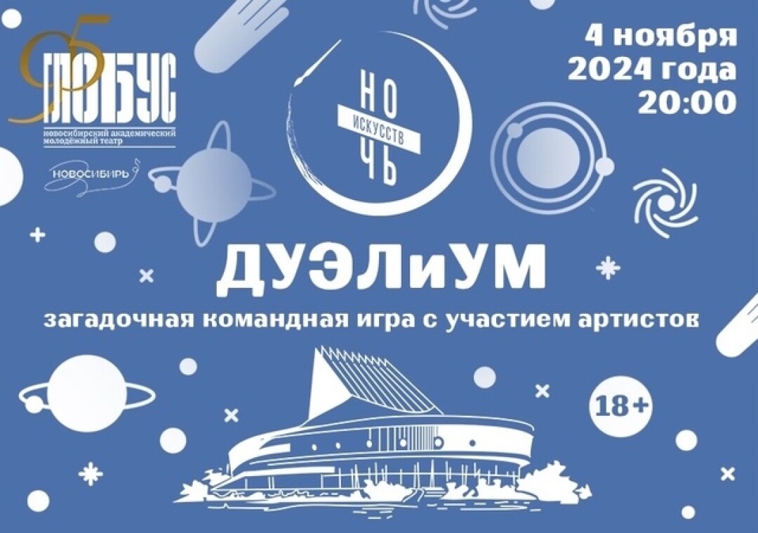 В рамках Всероссийской акции «Ночь искусств» театр «Глобус» проводит загадочную командную игру «ДУЭЛиУМ». Проект предназначен для азартных эрудитов. В игре примут участие артисты «Глобуса» – в каждой команде будет по одному игроку от театра. Десять команд попарно сойдутся в дуэли умов. Для победы понадобятся воображение, сообразительность и непременно чувство юмора. Команду-победителя ждет театральная награда.