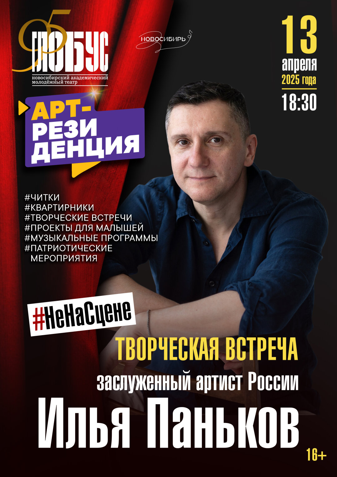 Арт-резиденция театра «Глобус» представляет творческую встречу #НеНаСцене с заслуженным артистом России Ильей Паньковым, ведущим актером Новосибирского академического молодежного театра «Глобус», доцентом кафедры актерского мастерства и режиссуры Новосибирского государственного театрального института.