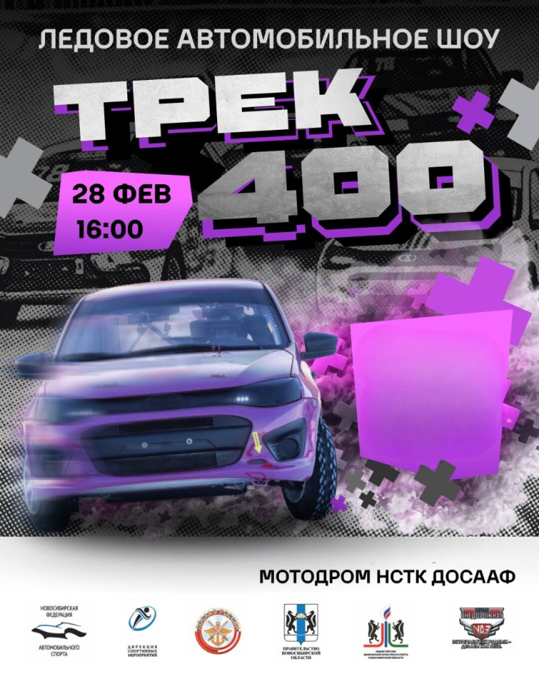 Не упустите шанс увидеть своими глазами настоящую автомобильную гонку на льду, почувствовать дыхание адреналина и зарядиться позитивными эмоциями вместе с участниками «Трек-400». Заезд на платную парковку на вашем автомобиле осуществляется только со стороны улицы Сибиряков-Гвардейцев. В стоимость заезда автомобиля включена стоимость билета водителя, остальные пассажиры приобретают входной билет. Дети до 6 лет могут пройти бесплатно.