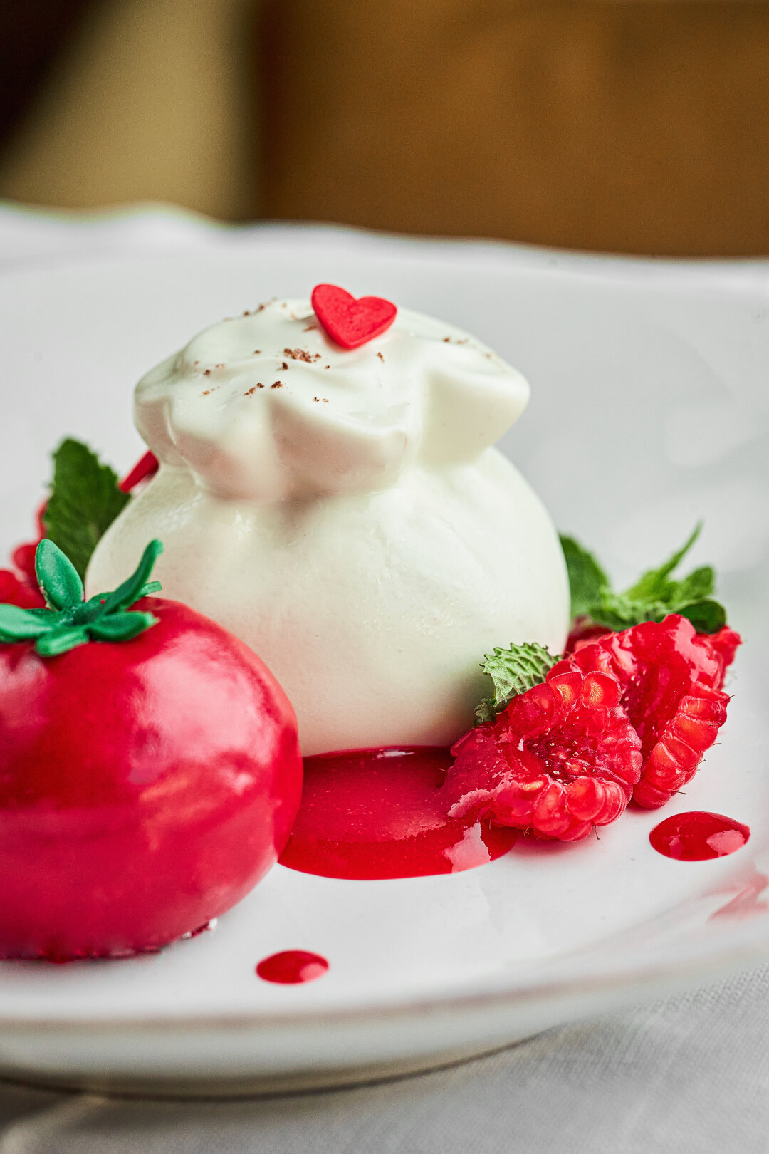 С 12 по 15 февраля бренд-кондитер ресторана подготовил специальный десерт «Сладкая парочка». Нежнейшая буррата, выполненная из воздушного ванильного мусса, и сочный томат из малинового крема — такие разные на первый взгляд, но на самом деле у них очень много общего: например, начинка из настоянного на базилике малинового желе, объединяющая «влюбленных» в единую композицию.
