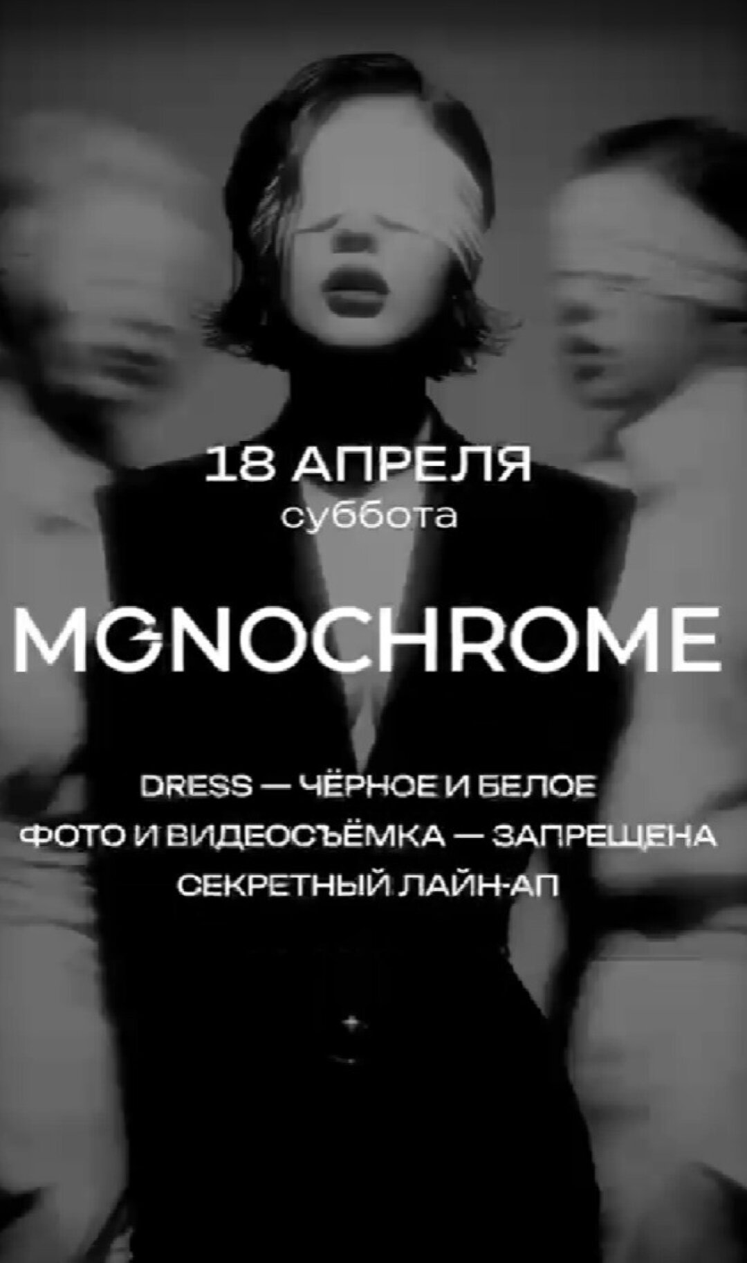 18 апреля в пространстве Stories пройдёт второй акт серии MONOCHROME — приватного формата, в котором фокус смещается с привычных ориентиров на чистое восприятие музыки и движения. Дресс-код в черно-белой гамме формирует единую визуальную среду, усиливая ощущение погружения. Лайн-ап не раскрывается — здесь важен не артист, а звук и состояние танцпола. Вечер проходит в режиме ограниченного доступа по спискам, а съемка полностью исключена: всё, что произойдет, останется внутри.