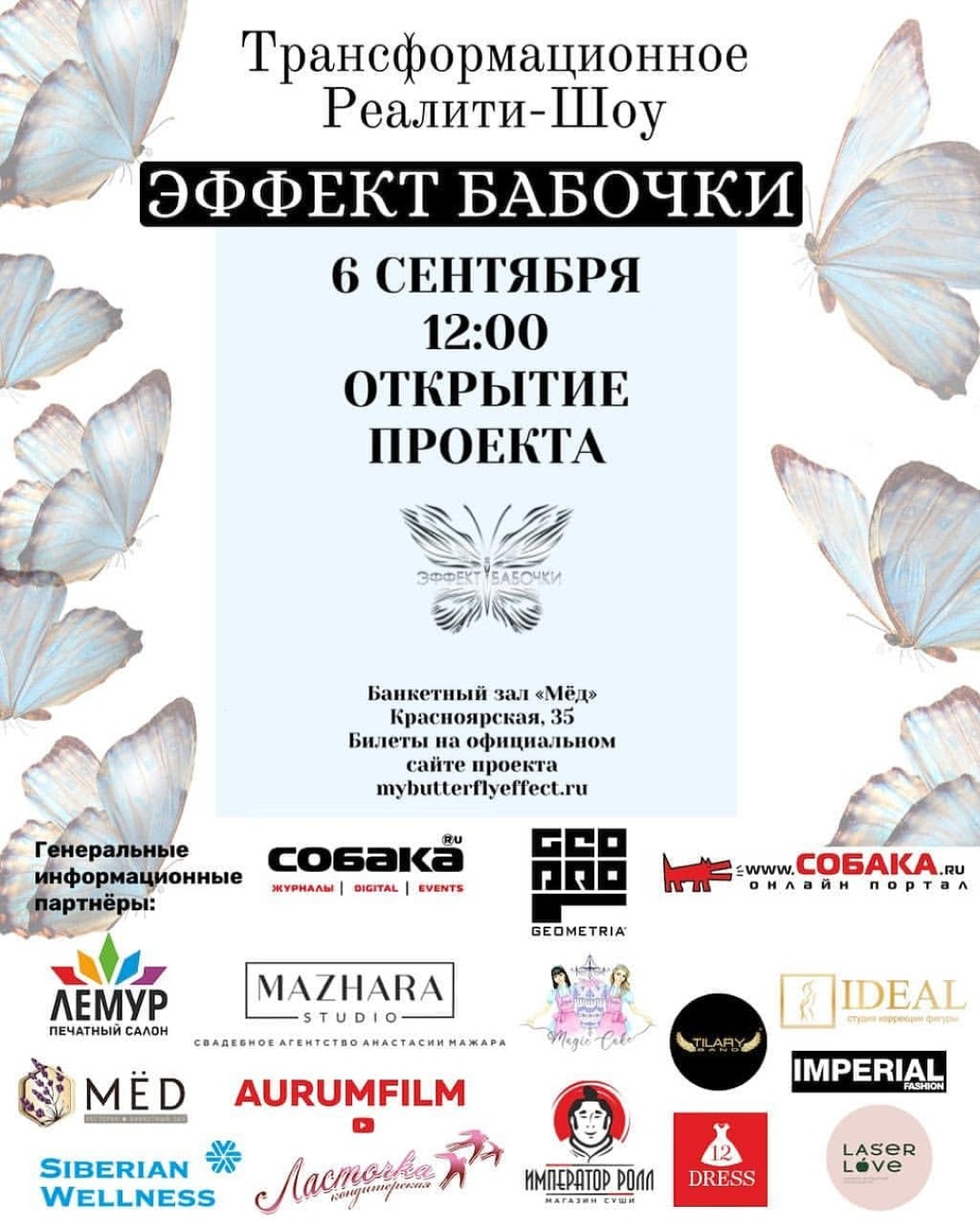 Мультимедиапроект Собака.ru приглашает на правах генерального информационного партнерства. Уже в это воскресенье, 6 сентября, состоится торжественное открытие реалити-шоу «Эффект Бабочки» в формате закрытого светского мероприятия.