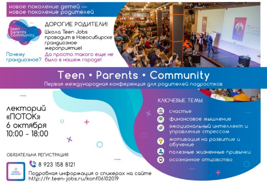 6 октября школа предпринимательства для детей и подростков TEEN JOBS проведет в Новосибирске первую международную конференцию, на которую приглашает родителей подростков, которые желают воспитать счастливого, успешного ребенка и понимать, как выстраивать доверительные отношения в связке «родитель — ребенок» и как обеспечить его благополучное будущее?