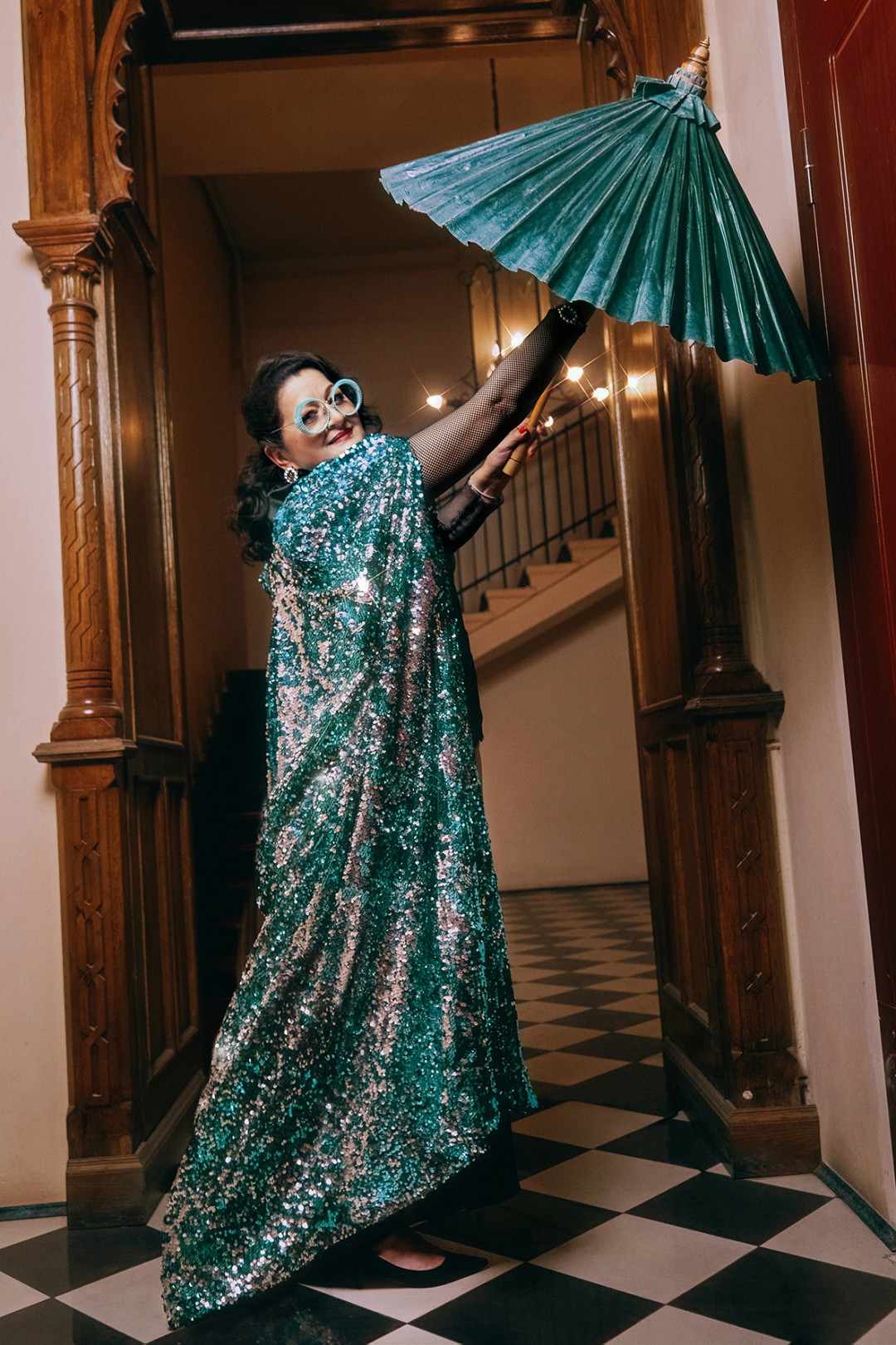 Серьги и браслет Gucci (все — ДЛТ), очки Oxydo, платье и накидка LyapinaK (все — собственность героини)