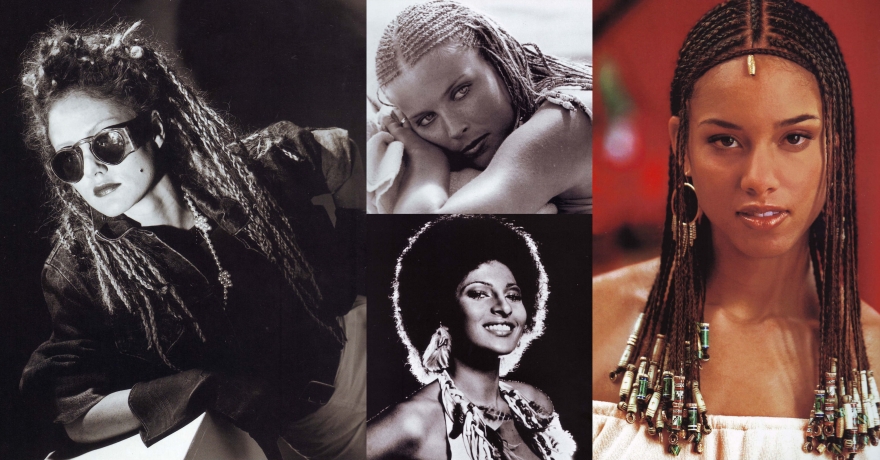 Афрокосички и прически афро, слева — 1980 год, сверху — 1979 год, снизу — 1974 год, справа —2002 год