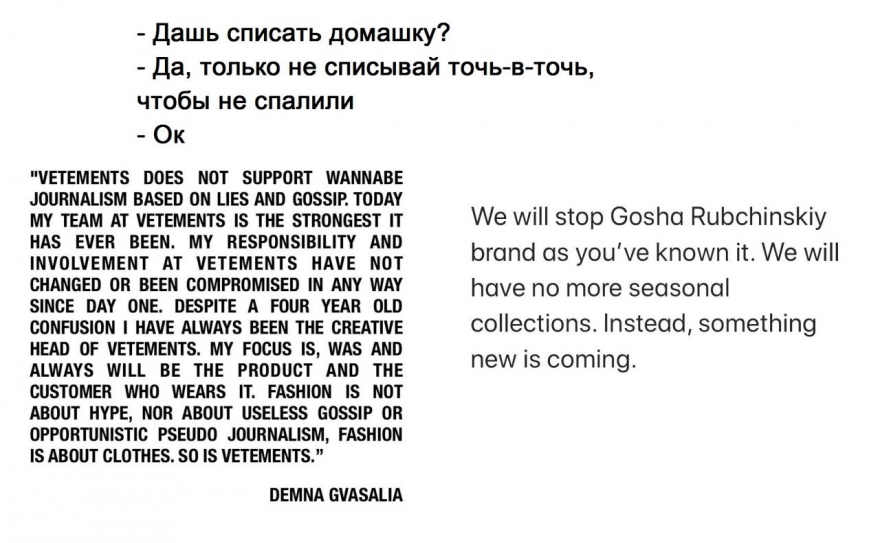 Одни ставят на повтор песню Монеточки «Гоша Рубчинский», другие переживают за фанатку бренда Кайли Дженнер, а третьи сравнивают дизайнера с Демной и Гурамом Гвасалия, которые на этой неделе «оправдывались» за плохие продажи Vetements. О том, чего на самом деле лишится мода с уходом Gosha Rubchinskiy, мы рассказали здесь.