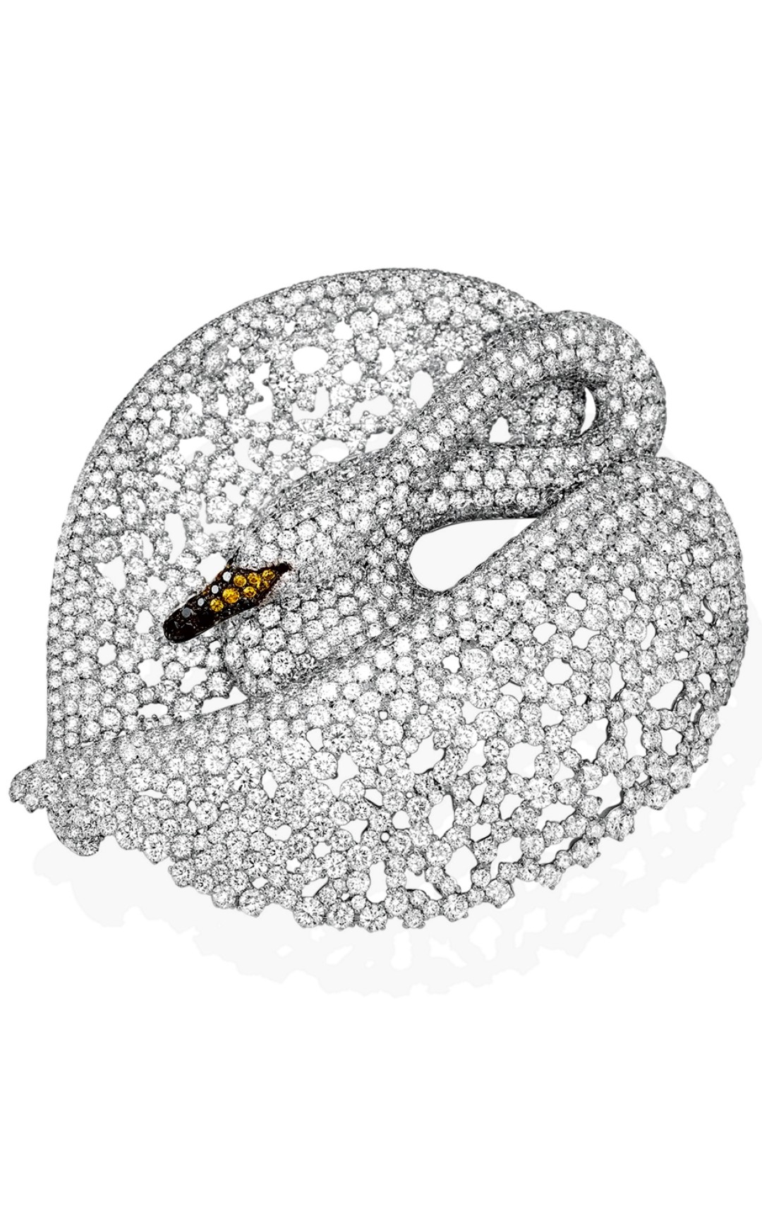 Лебединую верность этой броши хранить нетрудно: у 29 карат желтых сапфиров, белых и черных бриллиантов конкурентов быть не может.