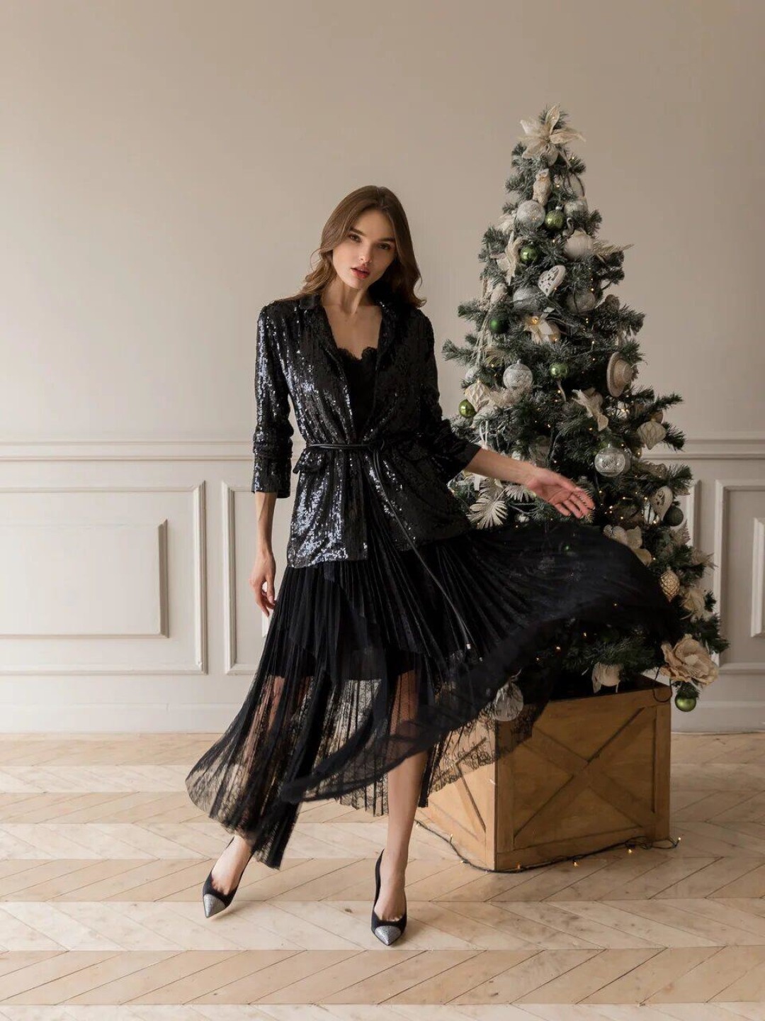 1. Сиять — девиз новогодней ночи. Жакет, декорированный пайетками может послужить главным украшением в образе, так как сам по себе самодостаточен. Сочетаем с красивыми кружевными платьями и классическими туфлями-лодочками.