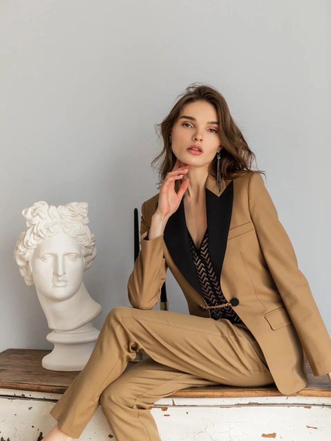 4. Идеальным вариантом для любительниц брючных комплектов, еще не решивших в чем встречать грядущий 2021 год Быка будет костюм оттенка Sandstone — «Песочный». Он будет выглядеть роскошно и в монохромном образе и в сочетании с другими цветами.