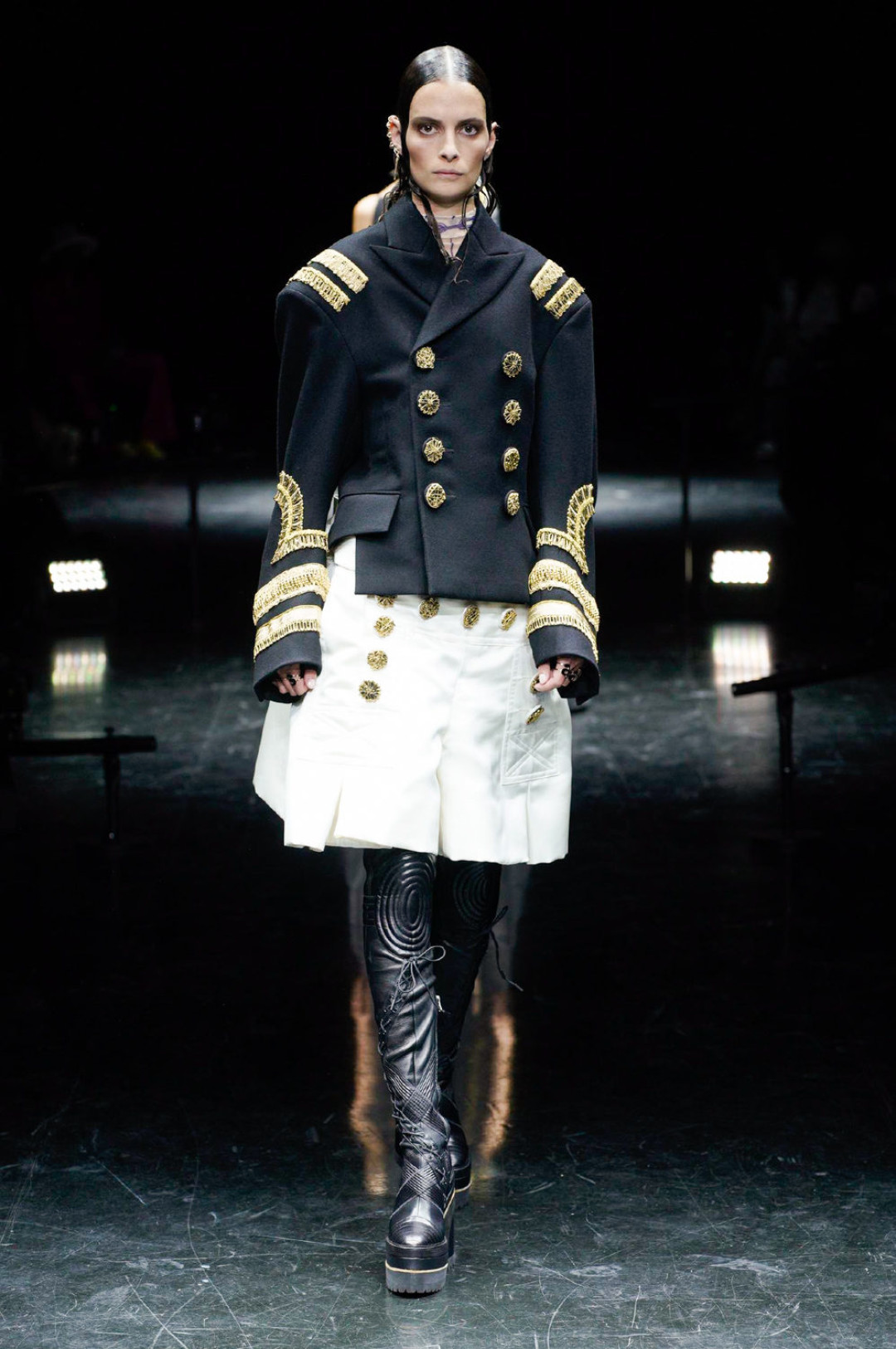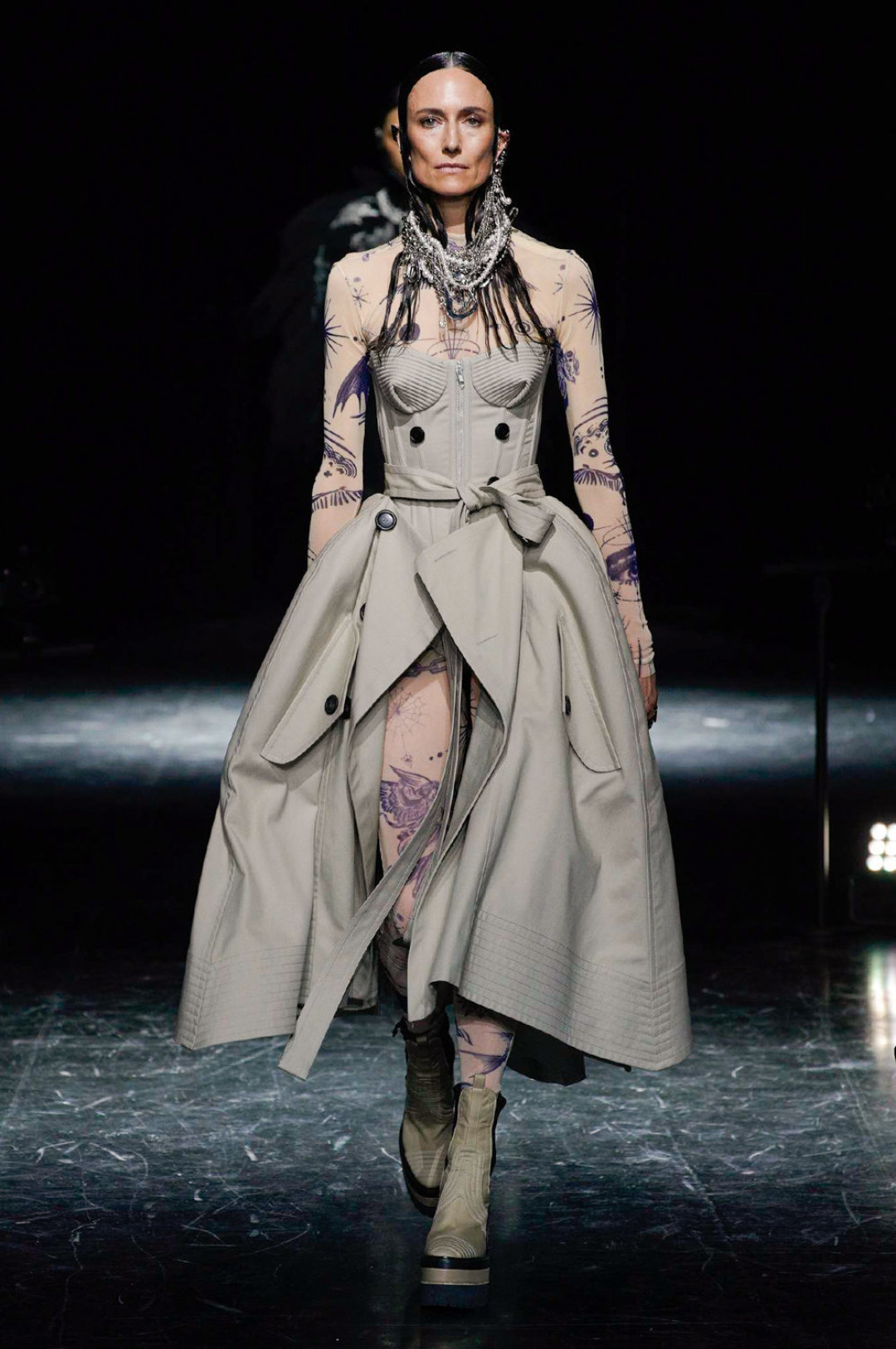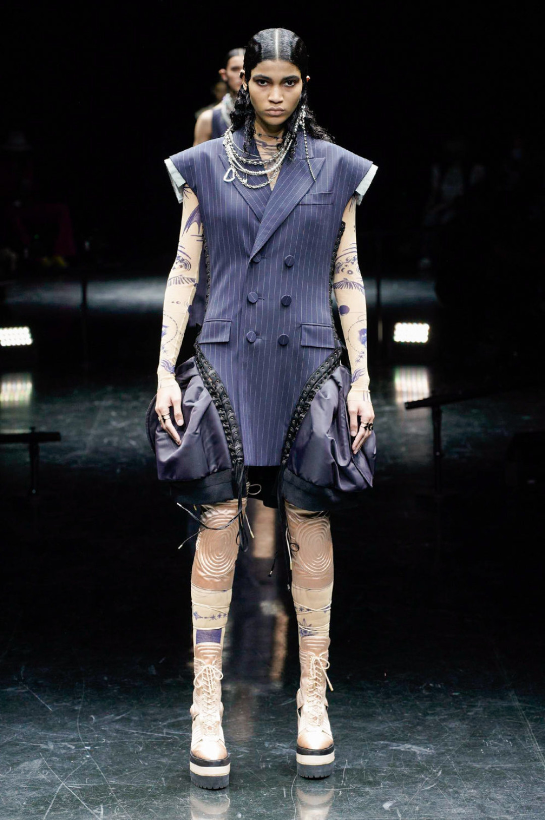 В кутюрную коллаборацию Jean Paul Gaultier х Sacai вошли корсеты, вещи с элементами деконструкции: платья, жакеты, юбки, знаковые для самого Жан-Поля Готье тельняшки, прозрачные боди, имитирующие татуировки на теле. В качестве украшений — массивные колье, браслет из булавок и пирсинг. О том, как он стал любимым элементом стилизации модных домов, мы рассказывали здесь.
