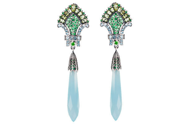 Cерьги «Кокошники», серебро, халцедон, хризолит, голубой топаз, цавориты