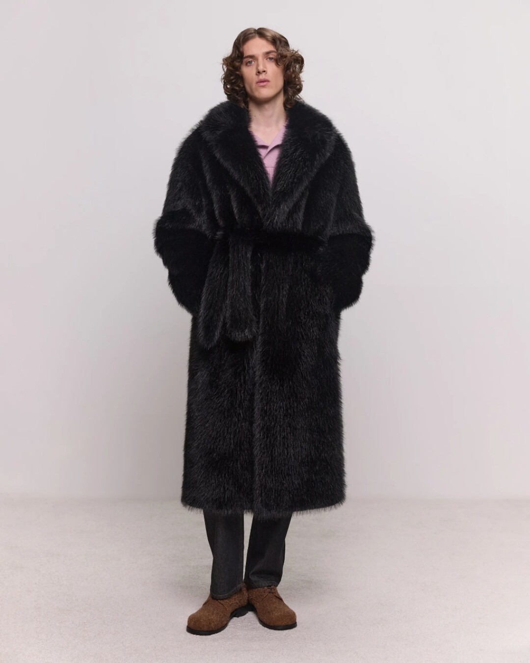 Новаторы в мире эко-устойчивых шуб Only me держат руку на фэшн-пульсе: на волне популярности мужчин в мехах запустили первый мужской дроп. В дебютной коллекции всего три модели, но зато каких! Вместо короткошерстных demure-бомберов только тотальный бояркор — две длинноворсых шубы-халата с английским воротником в черном и белом оттенках и (наш фаворит!) гиперобъемная и супердлинная, выполненная из пяти метров ткани с мехом псевдопесца (таких всего 8 штук).