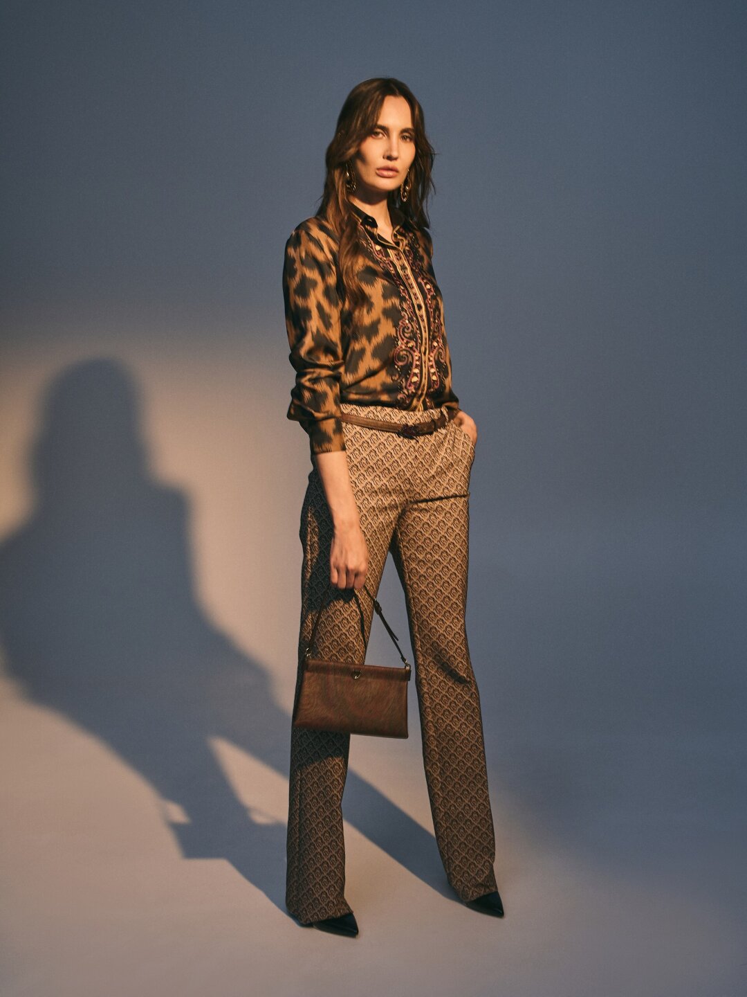 Роскошные образы можно найти и у бренда ETRO — образ с блузой с анималистичным принтом и чёрный костюм с фирменным узором пейсли.