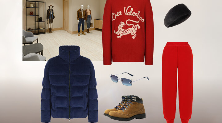 Окружающий мир заиграет новыми красками, если вместо серого худи надеть красный свитер Valentino и джоггеры Jil Sander. Образ завершат перчатки из овчины Giorgio Armani, меховая сумка Valentino и повязка MVST из норки. Яркий цвет поддержат шнурки меховых ботинок Santoni. Говорят, красный способствует приливу энергии — вот и проверим.