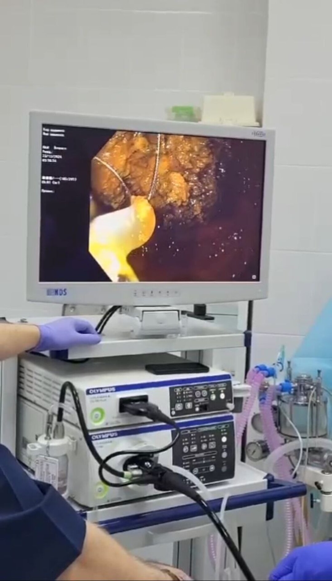 «Язва у пациента развилась в связи с фитобезоаром. Наша трёхдневная работа спасла его от большой операции и вскрытия полости желудка. Хирурги, когда его взяли на операцию, не вскрывали желудок и кишку, а просто низвели в толстую кишку уже небольшие фрагменты фитобезоара. Изначально безоар был 7-8 сантиметров», – рассказал заведующий отделением эндоскопии Баходур Бабаев.