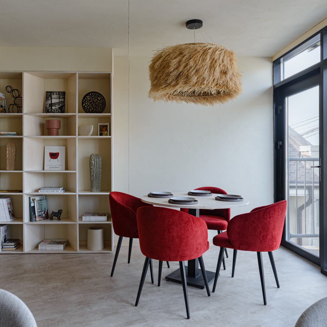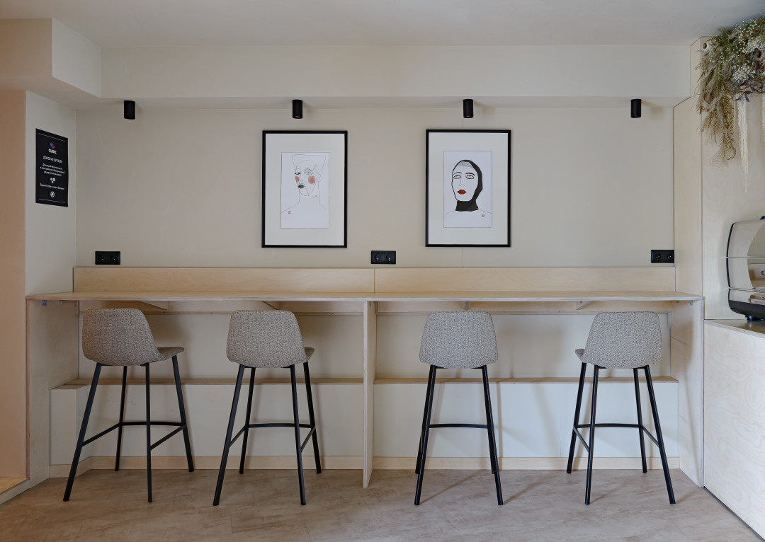Здание кафе «собрано» из трех морских контейнеров, объединенных в единое пространство. Это диктует свои условия: из-за узкой прямоугольной формы посадочные места размещены вдоль стен, а две несущие колонны интегрированы в конструкцию барной стойки. Уют помогают создавать в том числе и перегородки, которые делят пространство на три зоны. А за дизайн отвечают натуральные пшеничные оттенки с ягодными акцентами, черные графичные линии и мебель, созданная по эскизам Анны Михайловой. Творческую атмосферу заведения передает каждая деталь: произведения современного искусства, необычные предметы, зеркала, флористика, абажуры. А «правильное» настроение задает портретная графика художницы Ольги Каплан.