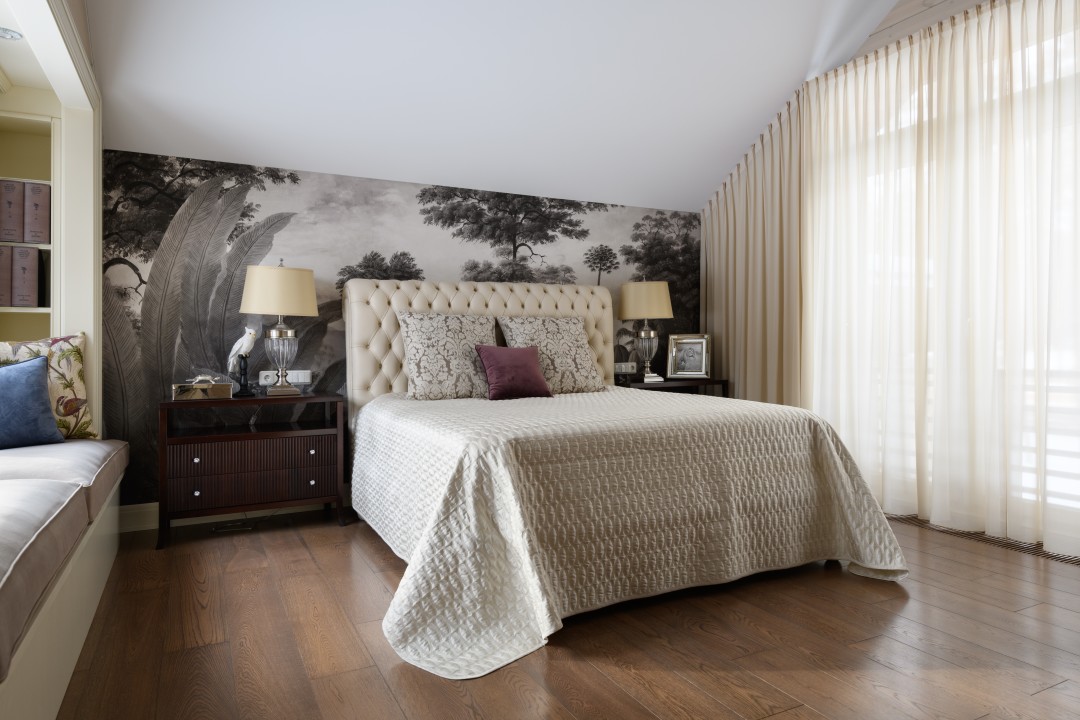 Интерьер выдержан в духе спокойной классики. Основной целью было избежать визуального «эффекта дачи», который часто появляется в помещениях с обилием деревянных поверхностей. Это было достигнуто за счет высоких окон и потолков, цветового решения, тонировки бруса, выбора текстиля.