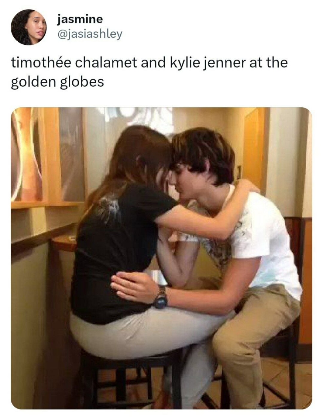 Каждое появление Кайли Дженнер и Тимоти Шаламе на публике порождает огромное количество мемов: фанаты и хейтеры звезд упражняются в остроумии. Выход на «Золотом Глобусе» не стал исключением — особенно, если учесть ситуацию с Селеной Гомес.