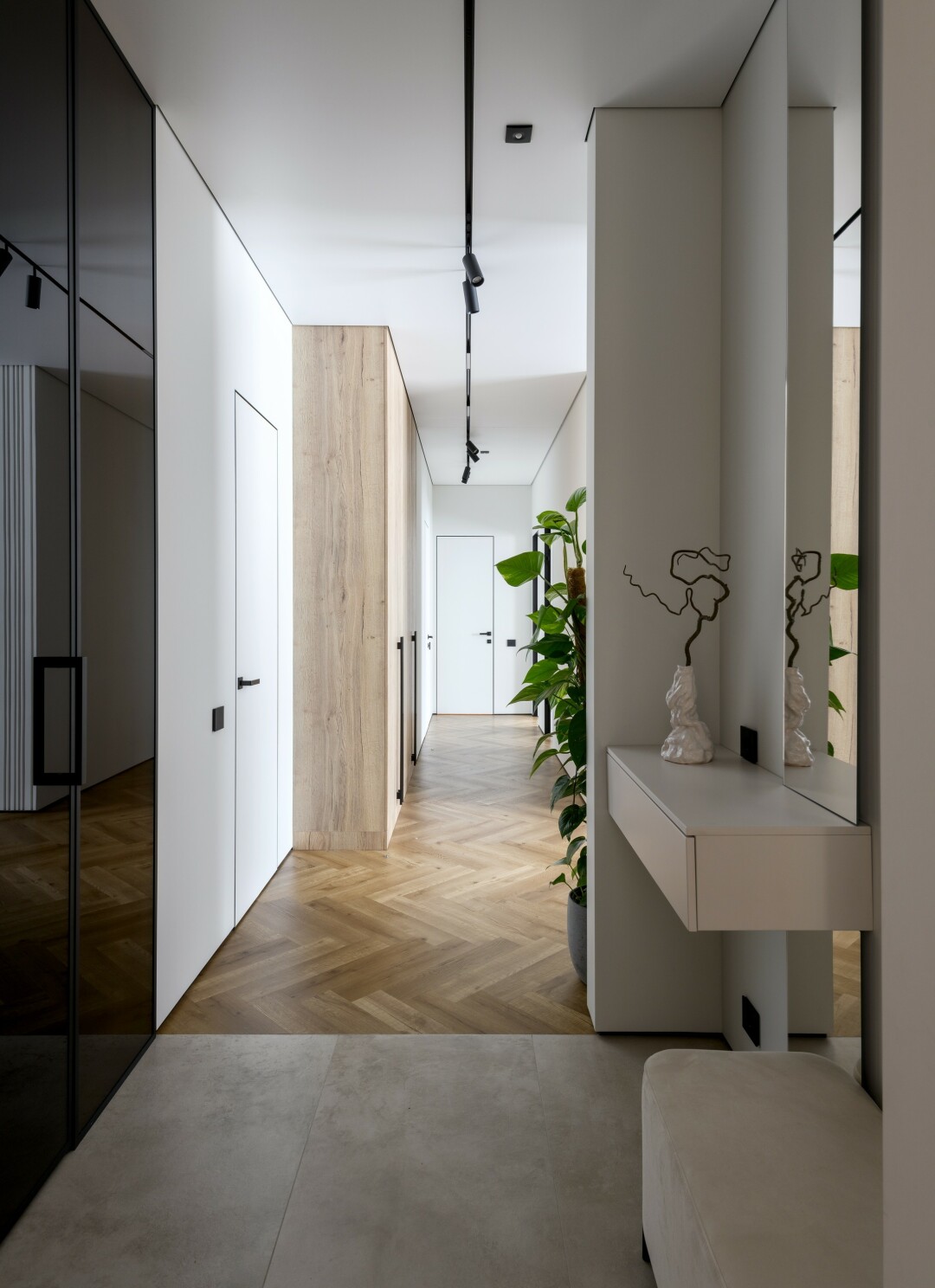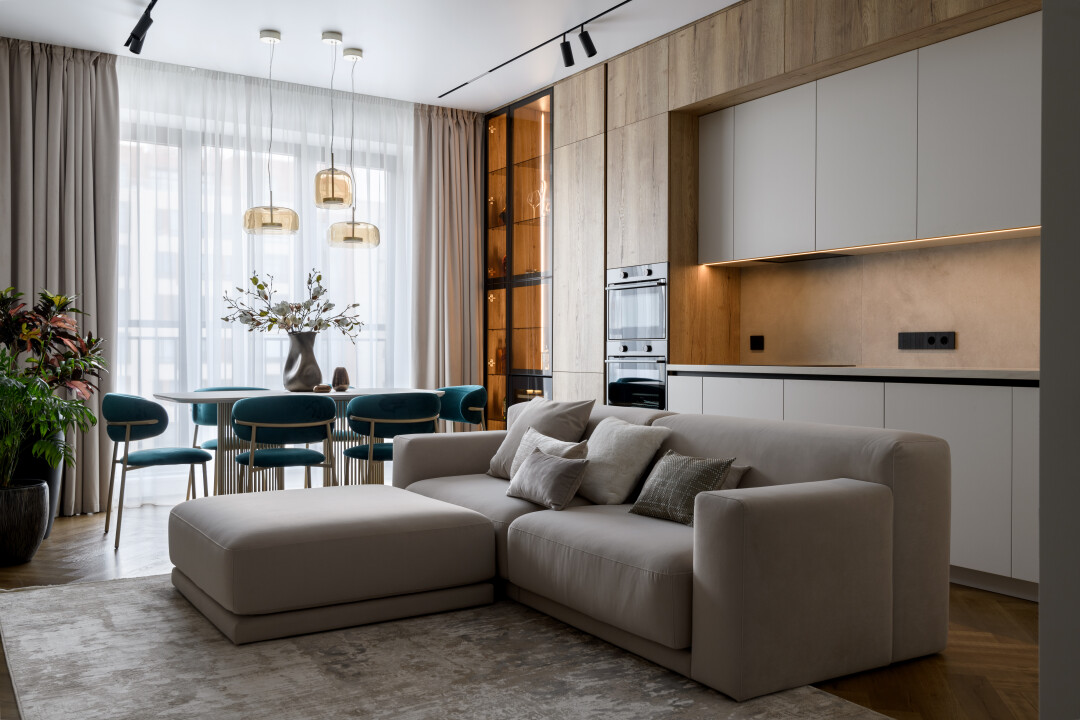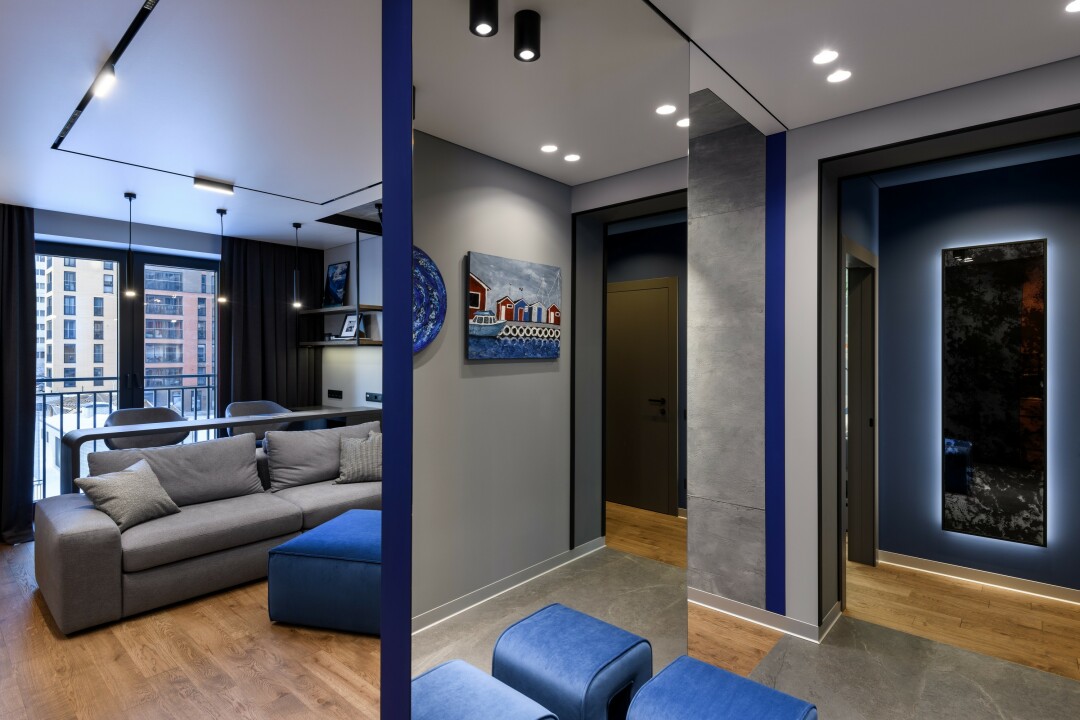Конечно, он должен соответствовать времени. Однако стоит учитывать, что сфера дизайна меняется очень быстро, материалы и технологии постоянно обновляются, поэтому очень важно быть в курсе событий — изучать новинки, посещать тематические выставки. Но, прежде всего, ремонт должен быть функциональным и удобным для жизни конкретного человека. Банально — не вставать с кровати, чтобы выключить свет, а делать это с помощью пульта или проходных выключателей. Однажды мы даже провели шумоизоляцию подъезда и лифта, чтобы звуки не доносились в квартиру, так как для заказчика принципиальна тишина.