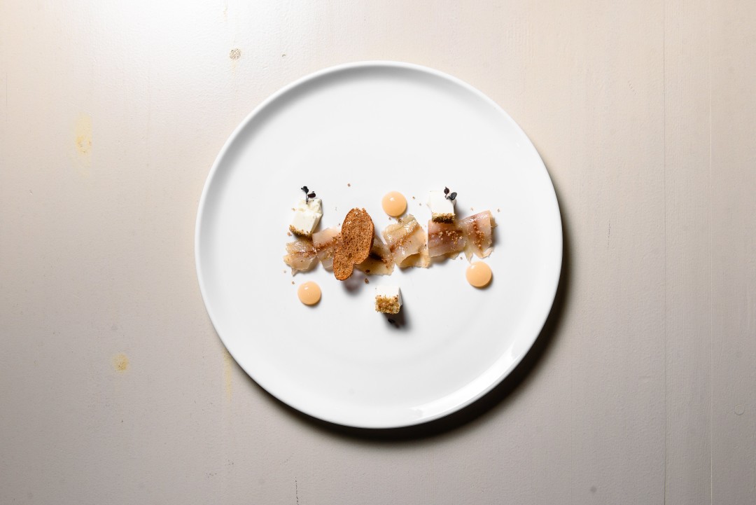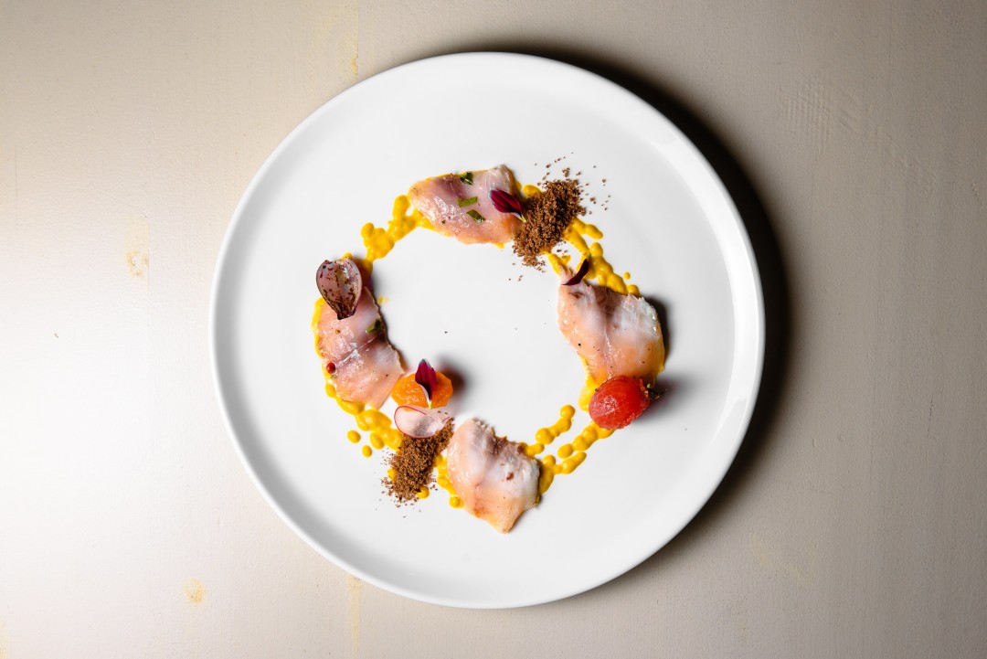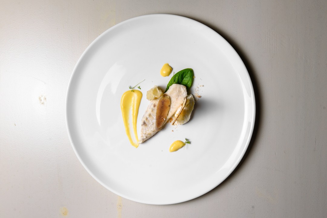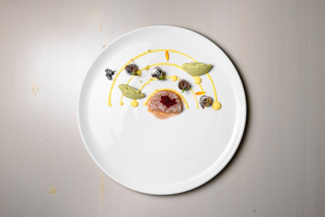 Романов Артем - провисная ставридка с креветкой конфи с легким шафрановым соусом и воздушным кремом из аввокадо.