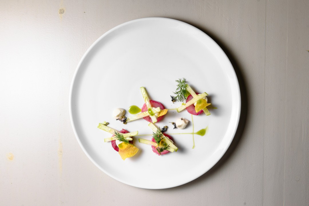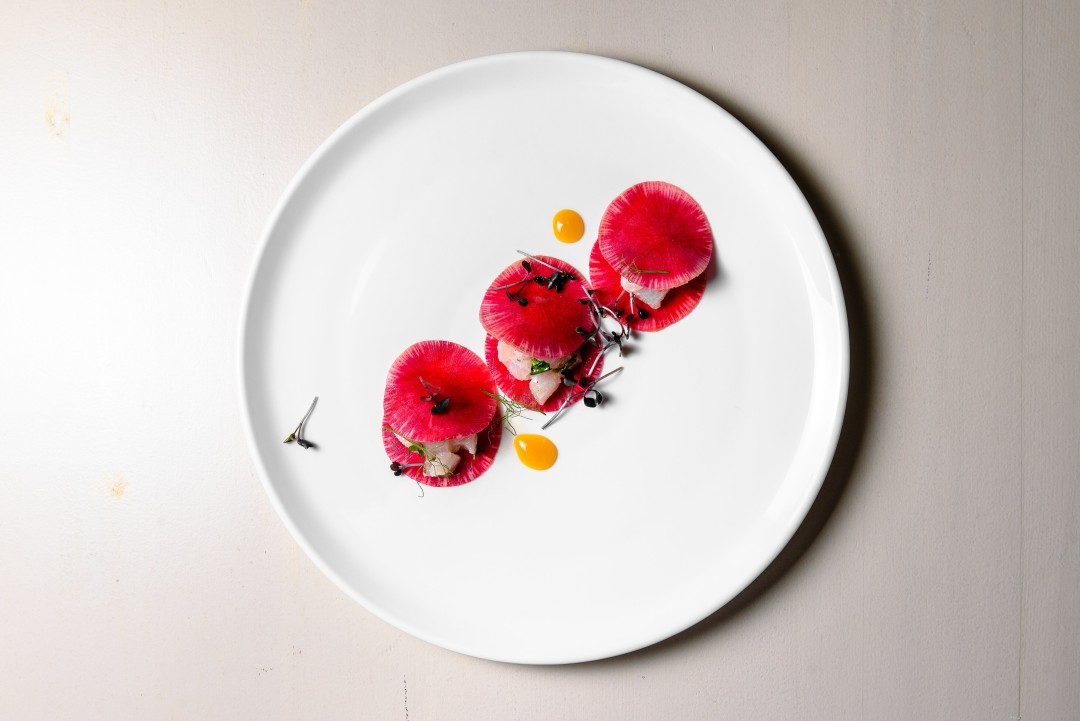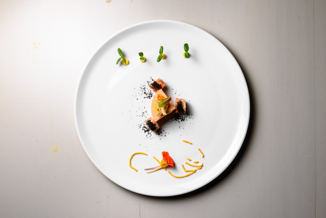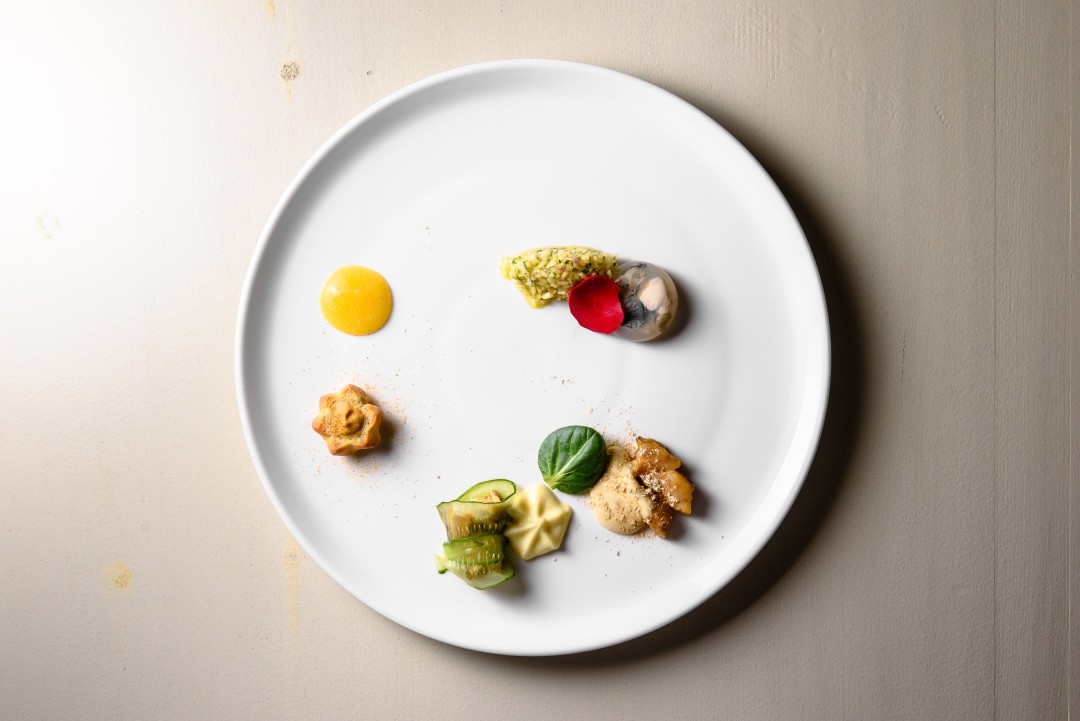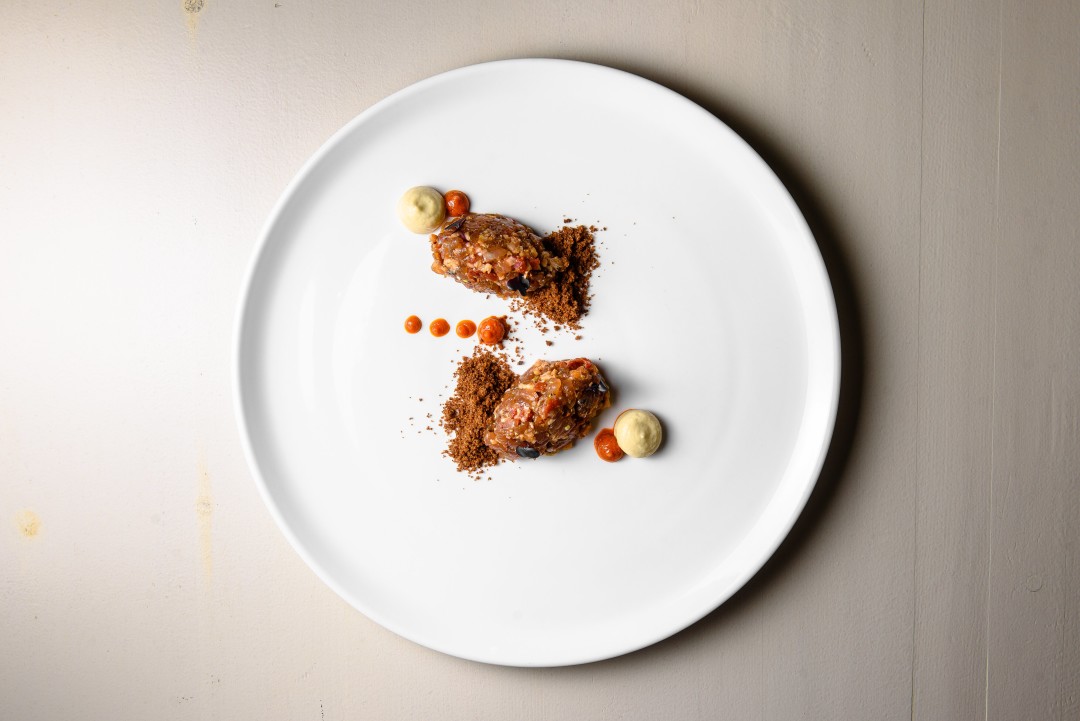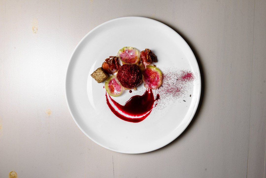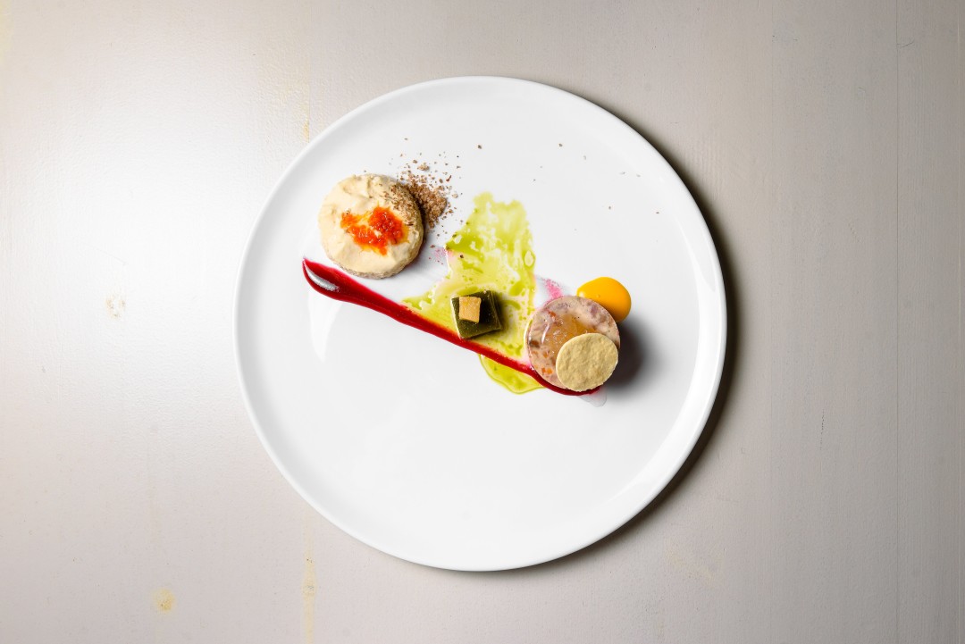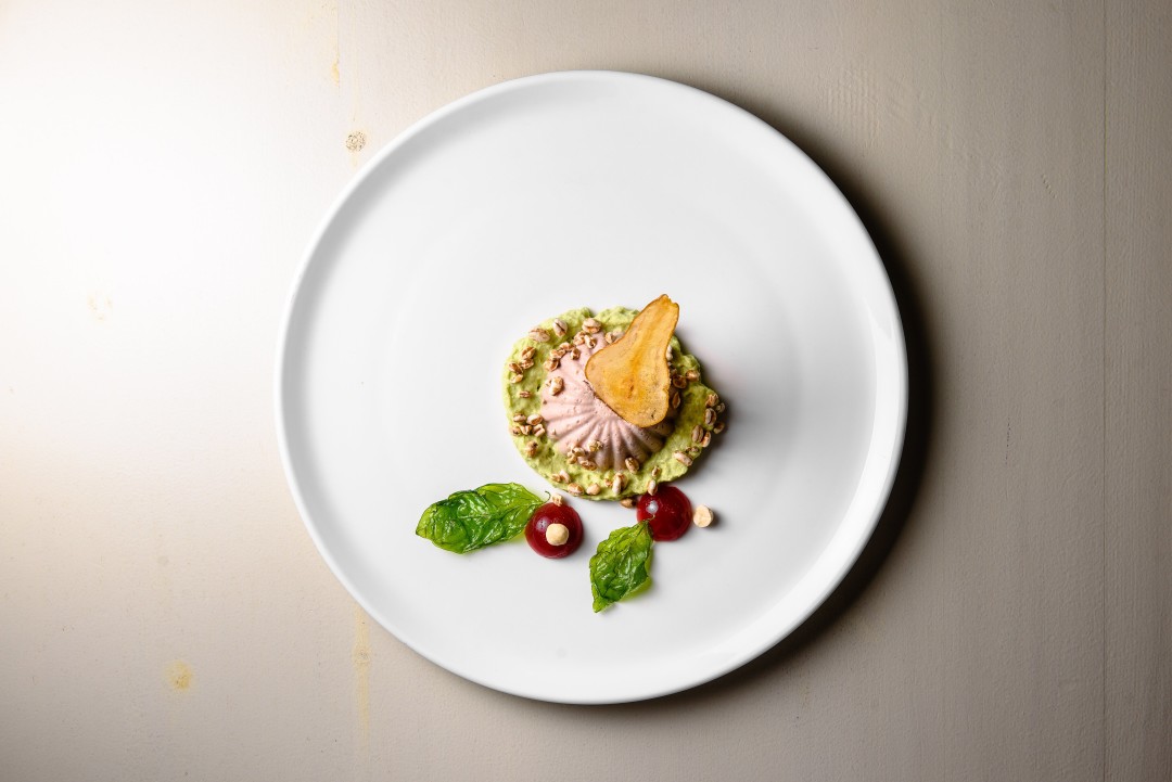 Нерода Александр - брейсер из локальных морепродуктов в съедобном мхе и батарге из лобана с чипсой из каштана, под пряно-сливочным соусом в дуэте с эстрагоновым маслом.  Подается с панокотой из корня  сельдерея и кремом из томленной  айвы с курагой в сочетании  с яблочным конфитюром декорированными яблочной бумагой в свекольной пудре.  Подчеркивает блюдо соус  из кураги и морковной эммульсии в дополнении к яблоку сувид в пряном  свекольном фреше с карамелизированной морковью.